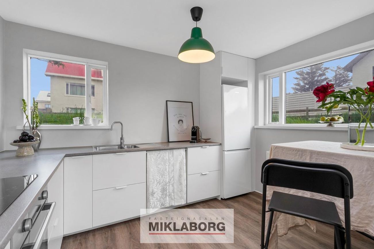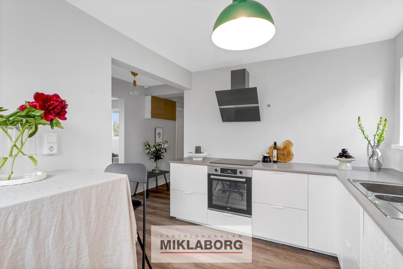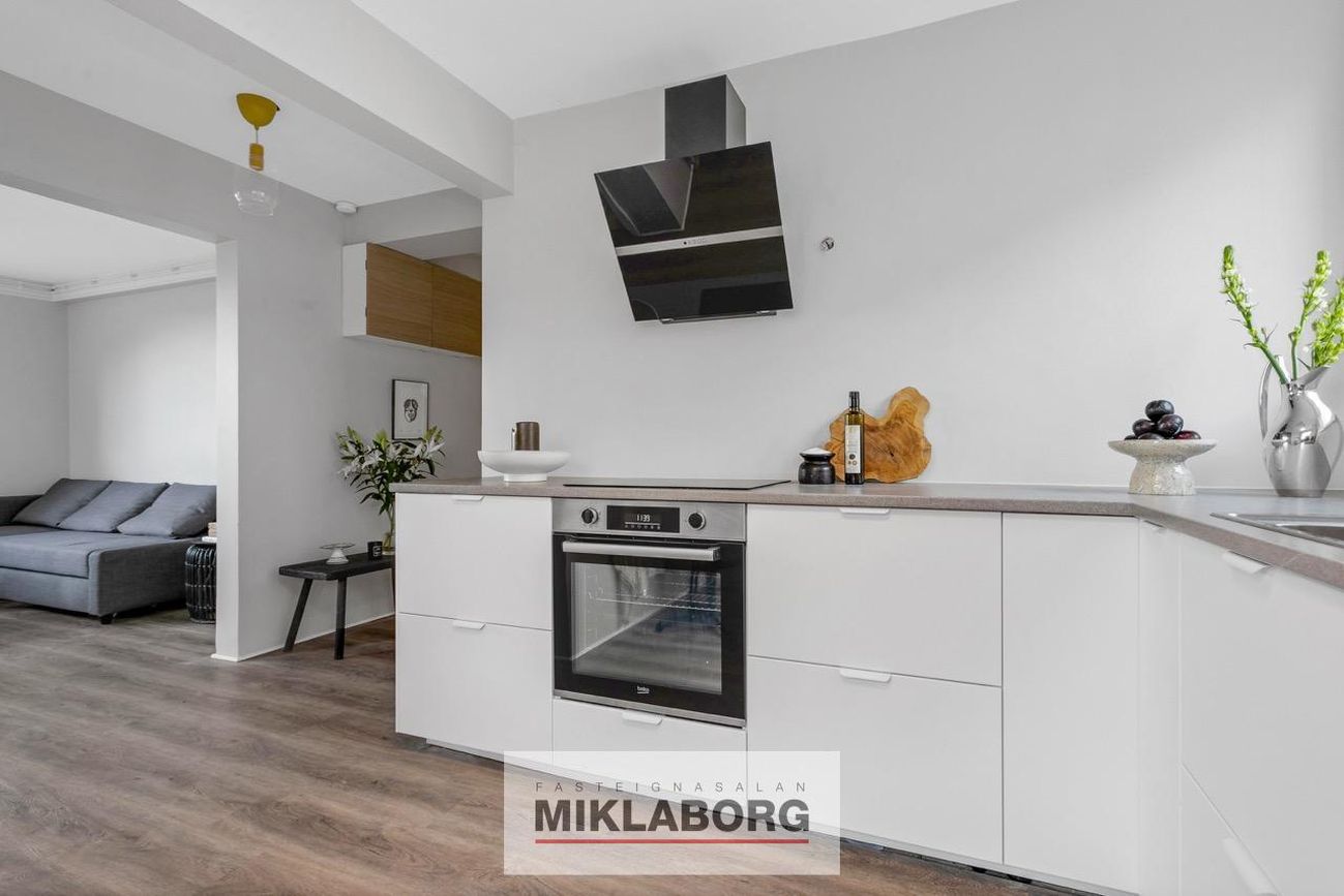 Eldhús: nýleg ljós innrétting með grárri borðplötu, helluborði, bakaraofni og vegghengdum háfi, endurnýjað 2024. Pláss er fyrir uppþvottavél og ísskáp í innréttingu.