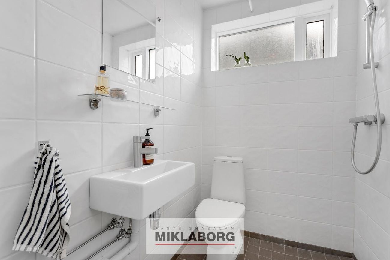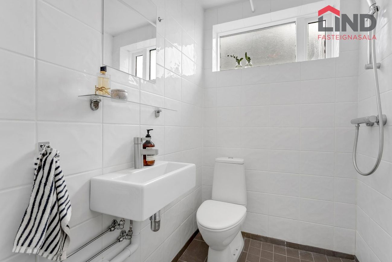 Baðherbergi: flísalagt hólf í gólf, sturta, salerni, vaskur og handklæðaofn.