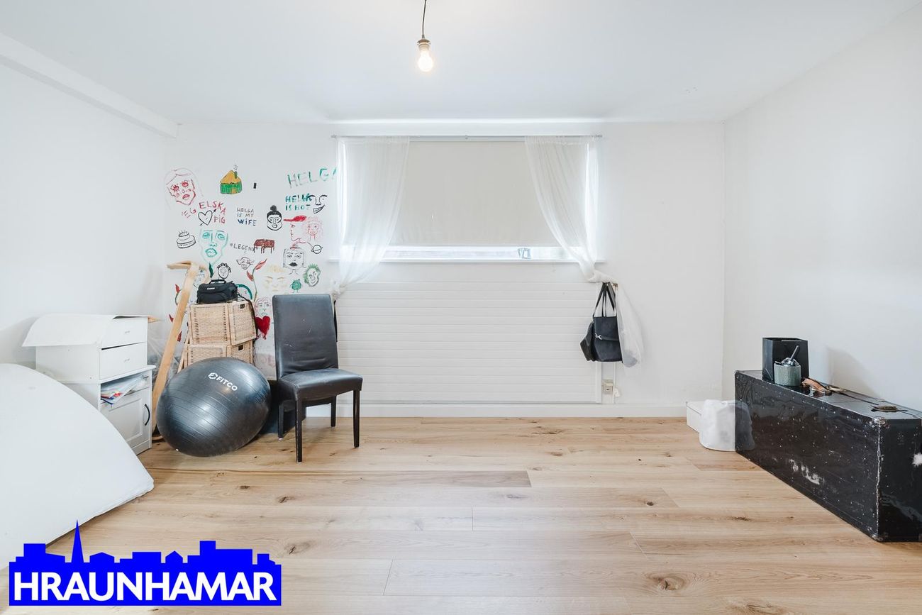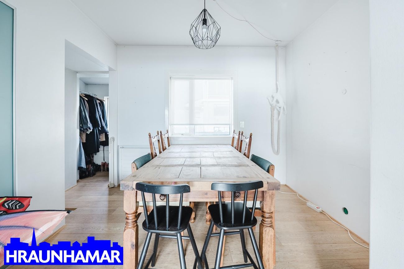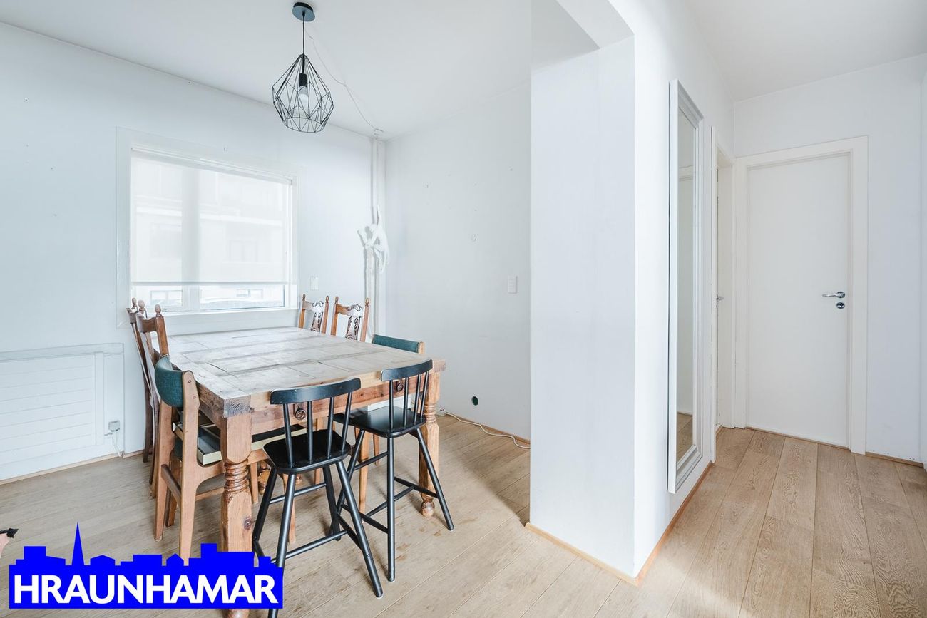 Sameiginlegur inngangur með efri hæðinni og hæðin skiptist í anddyri, hol, eldhús, stofu, borðstofu, svefnherbergi og baðherbergi. Möguleiki á að bæta við herbergi þar sem borðstofa er núna. ( Það er þannig á teikningu) Parket á gólfum en flísar á baðherbergi.