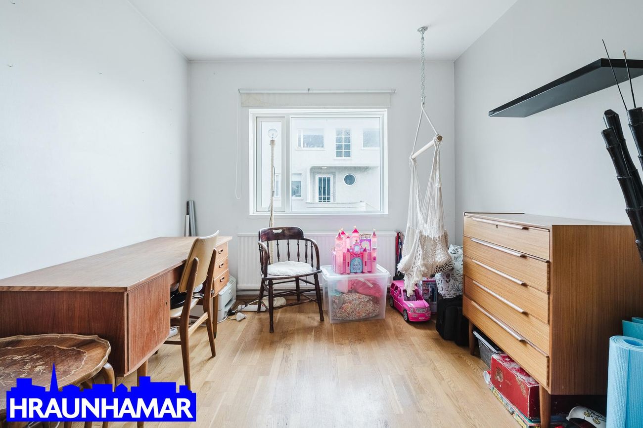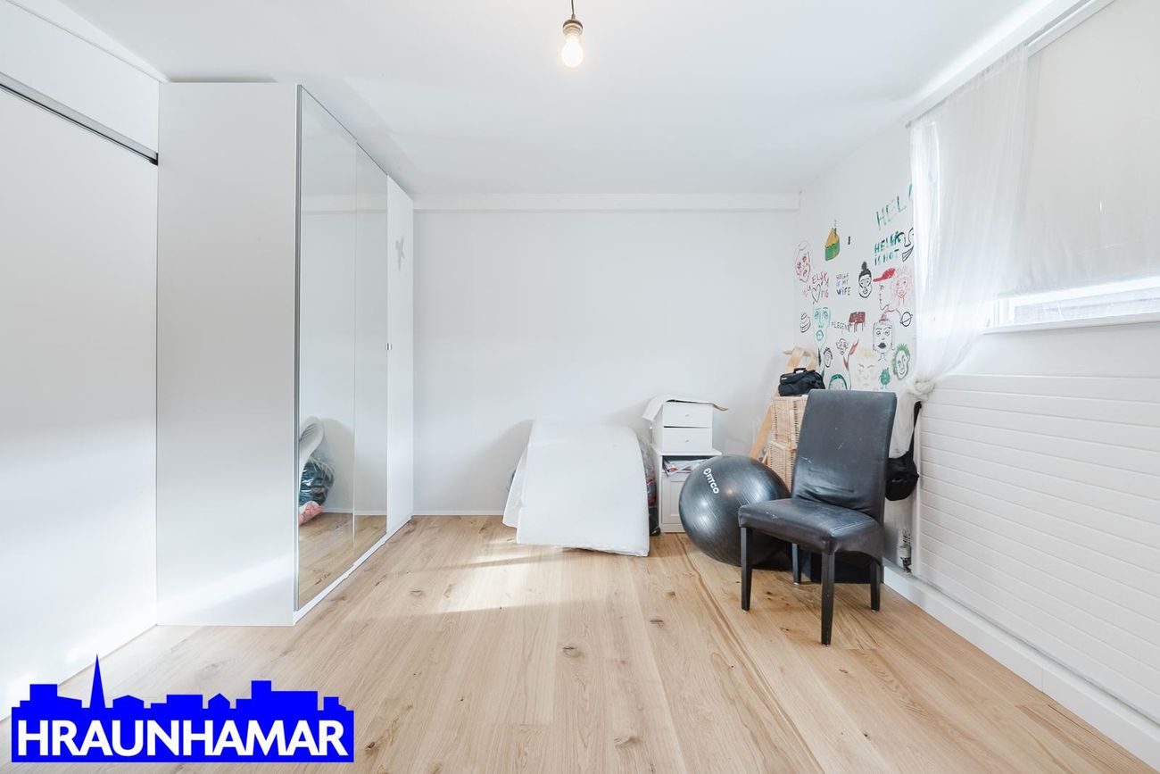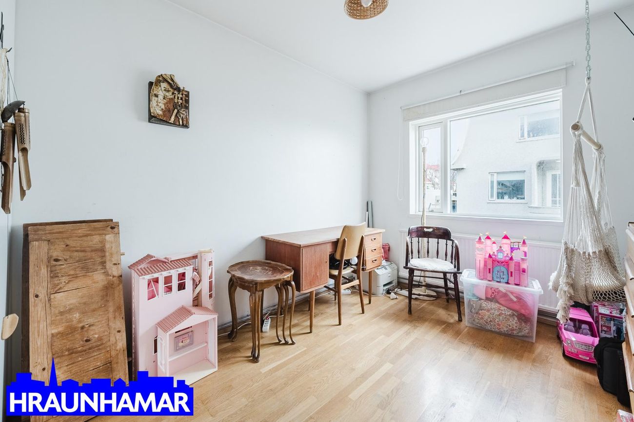 Sameiginlegur inngangur með efri hæðinni og hæðin skiptist í anddyri, hol, eldhús, stofu, borðstofu, svefnherbergi og baðherbergi. Möguleiki á að bæta við herbergi þar sem borðstofa er núna. ( Það er þannig á teikningu) Parket á gólfum en flísar á baðherbergi.