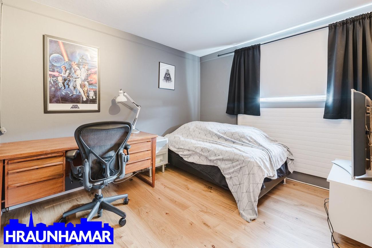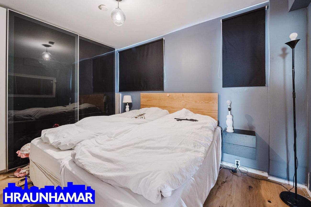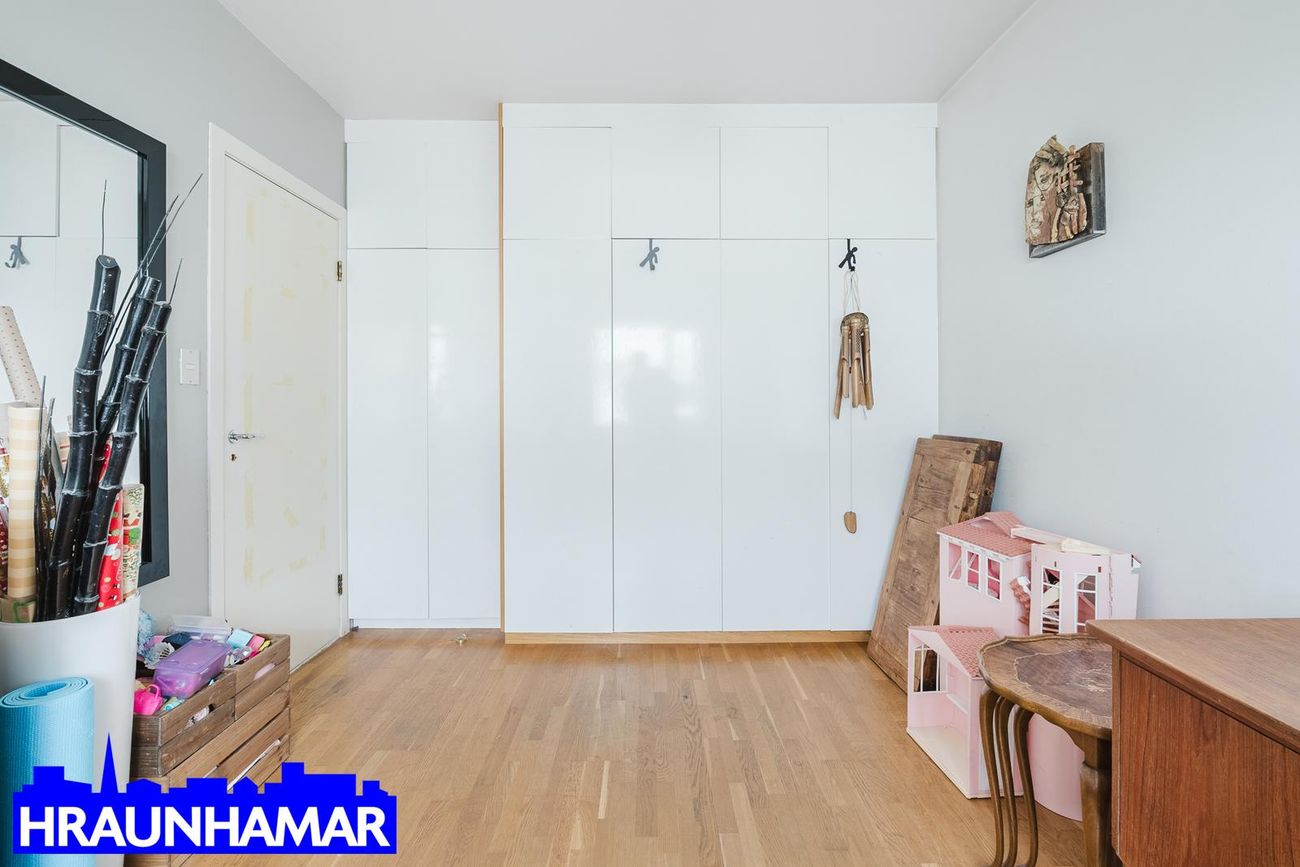 Hjónaherbergi/svefnherbergi: Rúmgott með fataskáp, parket á gólfi.