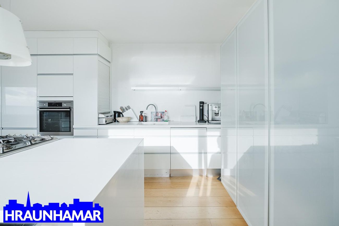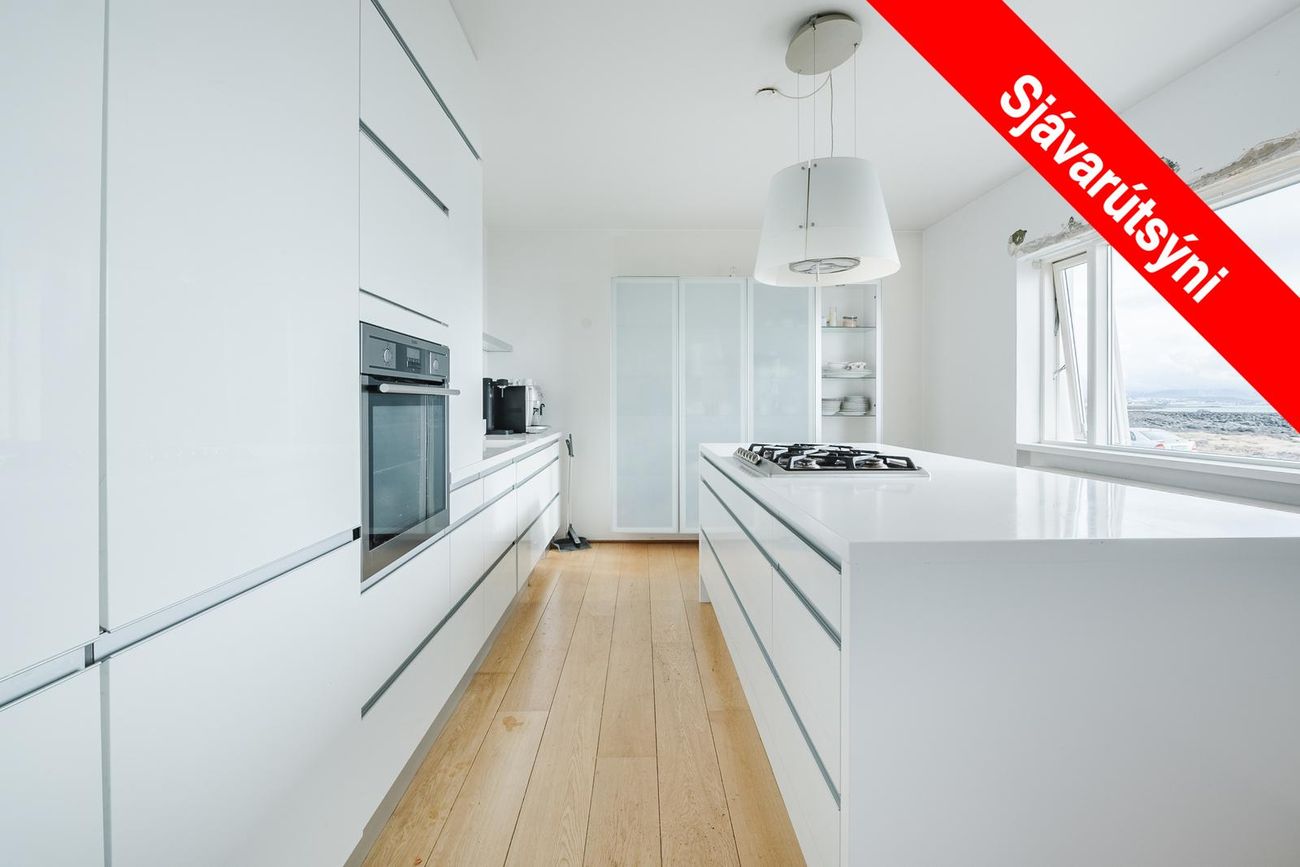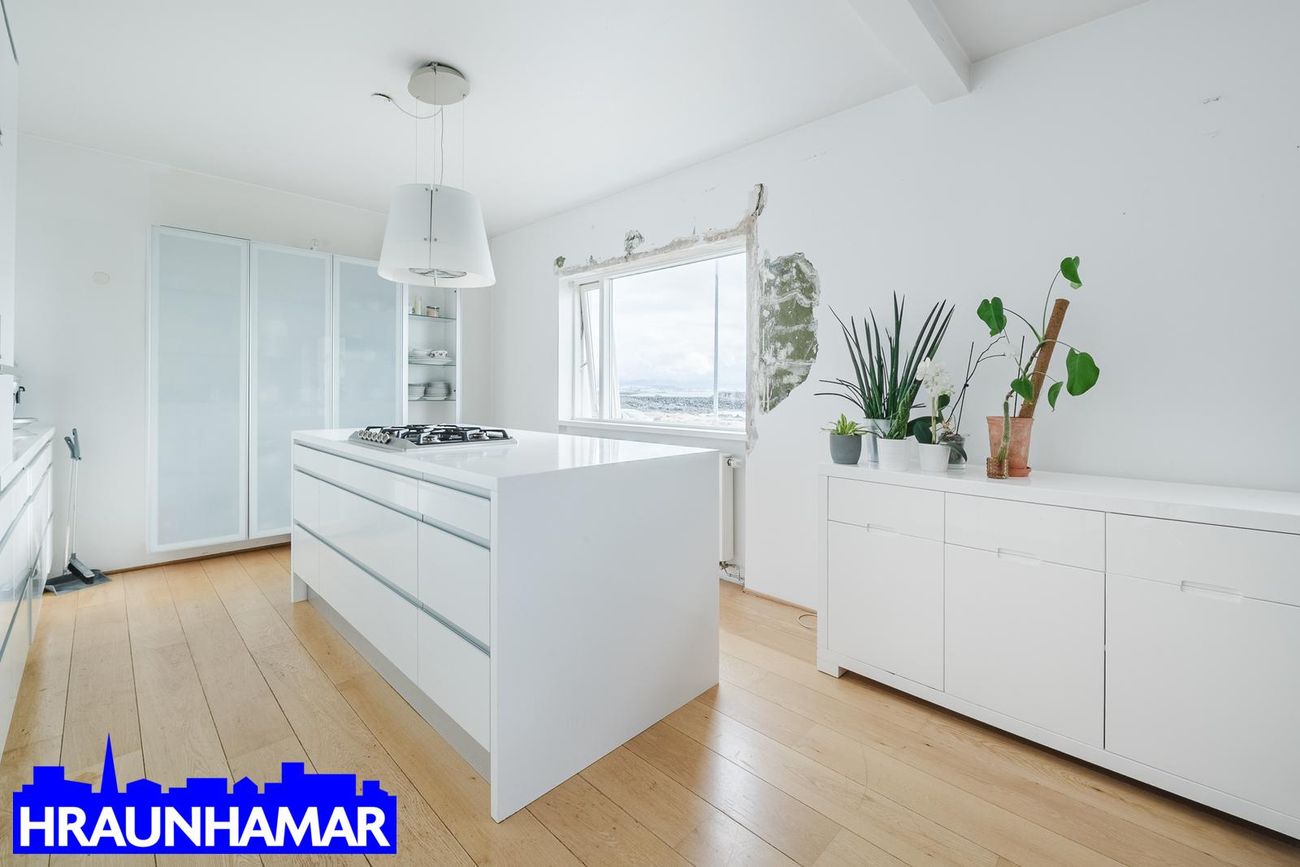 Stofa og Eldhús: Opið og bjart rými með einstöku útsýni, parket á gólfi. Stór eyja í eldhúsi, nýlegt með hvítri innréttingu.