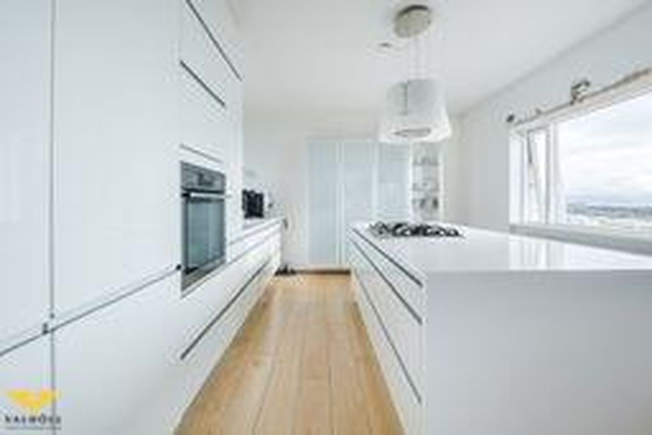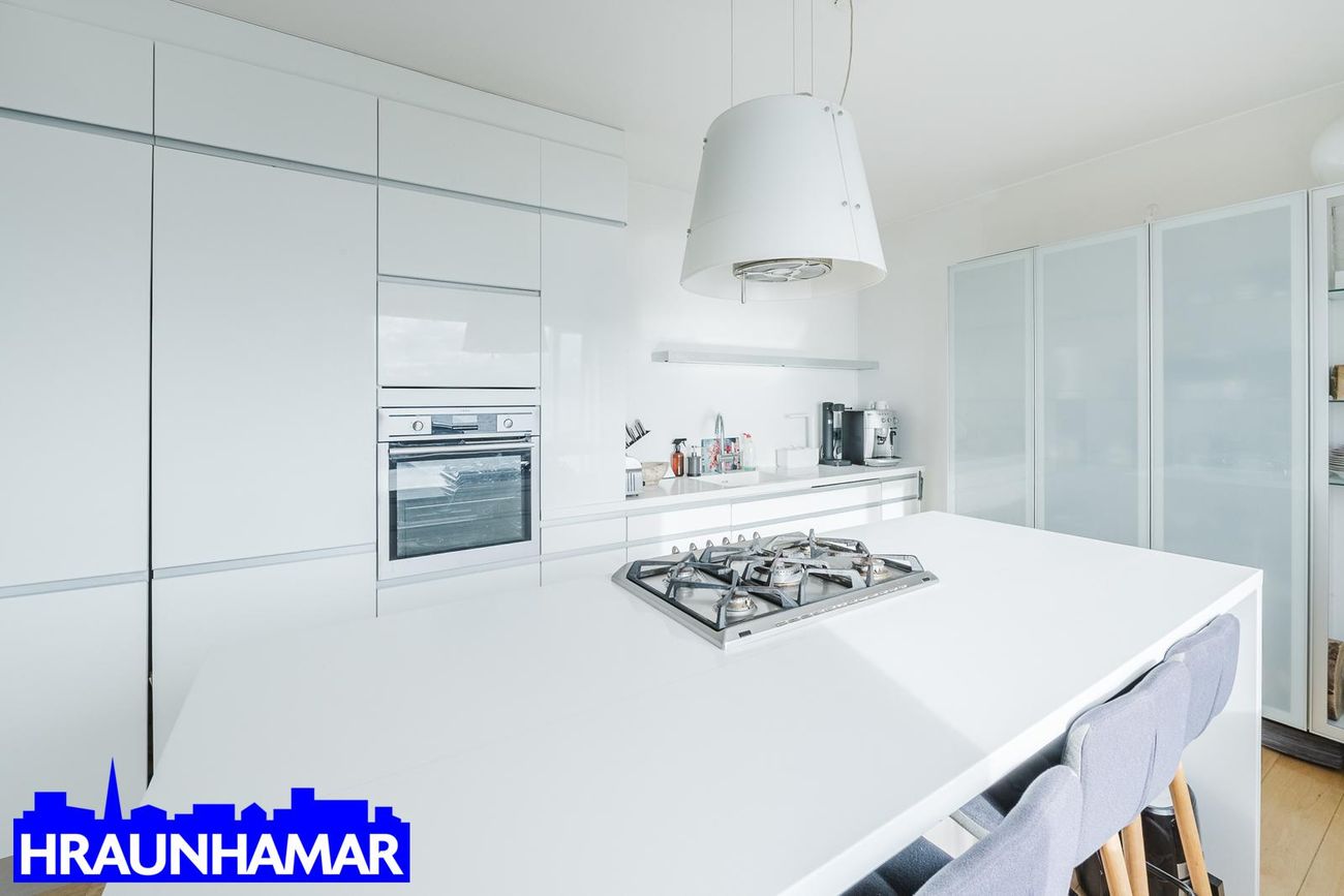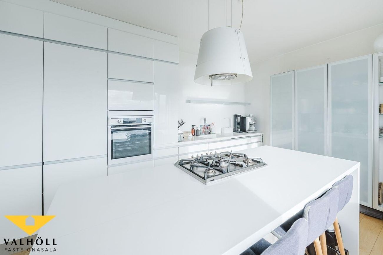 Stofa og Eldhús: Opið og bjart rými með einstöku útsýni, parket á gólfi. Stór eyja í eldhúsi, nýlegt með hvítri innréttingu.