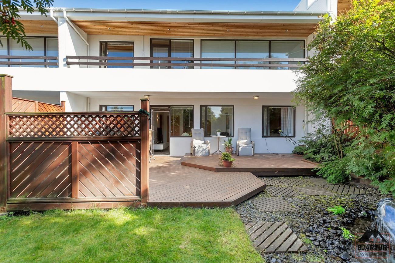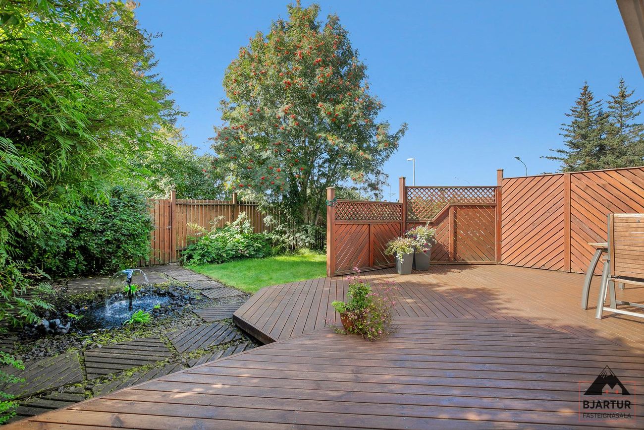 Úr snjónvarpsholi er útgengi á viðarpall og fallegan garð. Flísar á gólfi með gólfhita.