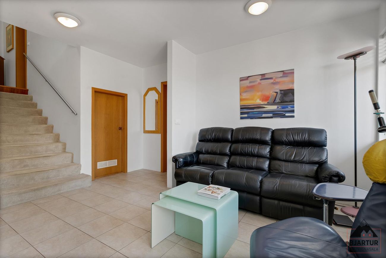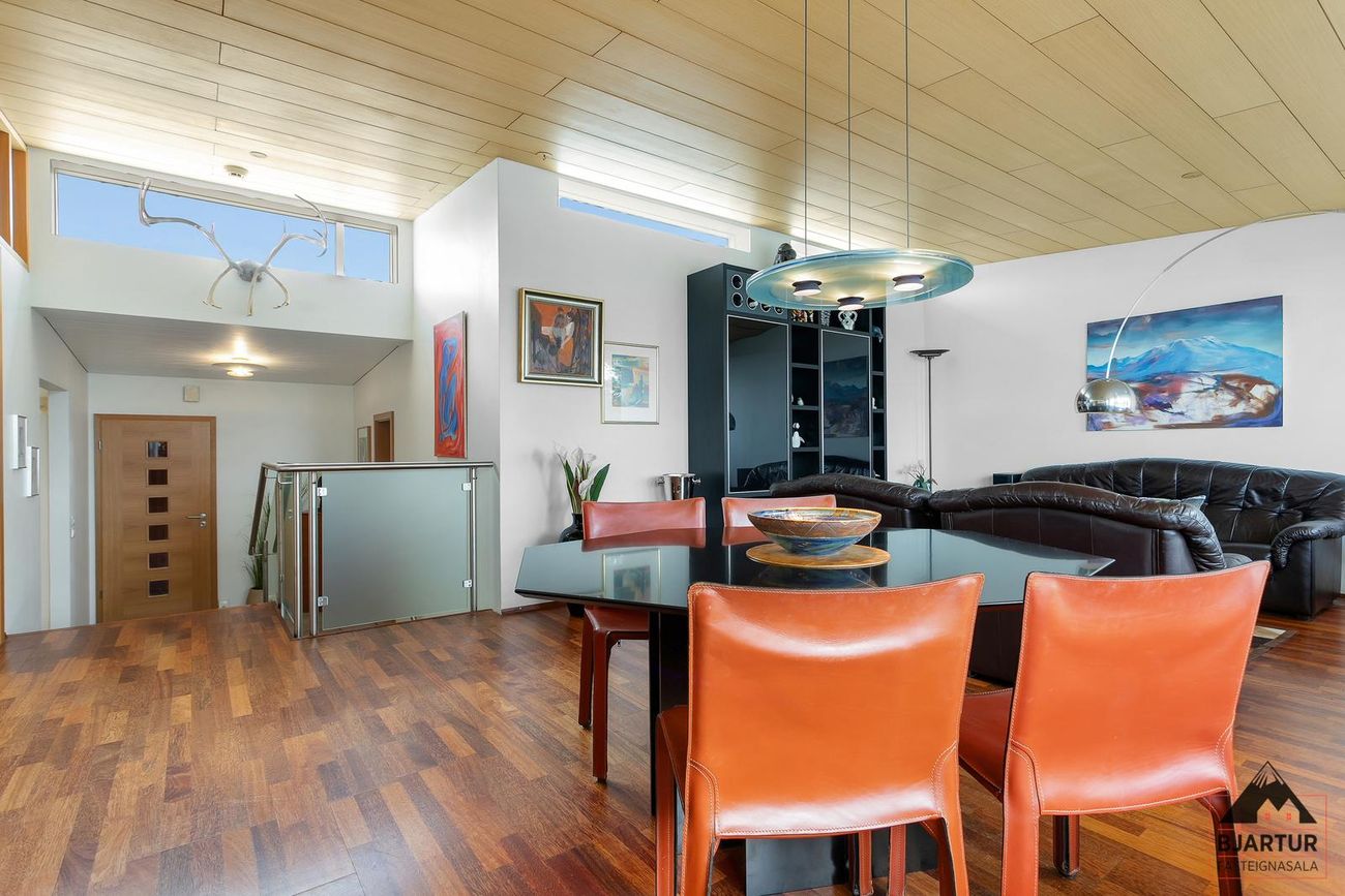 Efri pallurStofa og borðstofa eru í opnu rými með útgengi á flísalagðar svalir sem liggja meðfram stofunum.