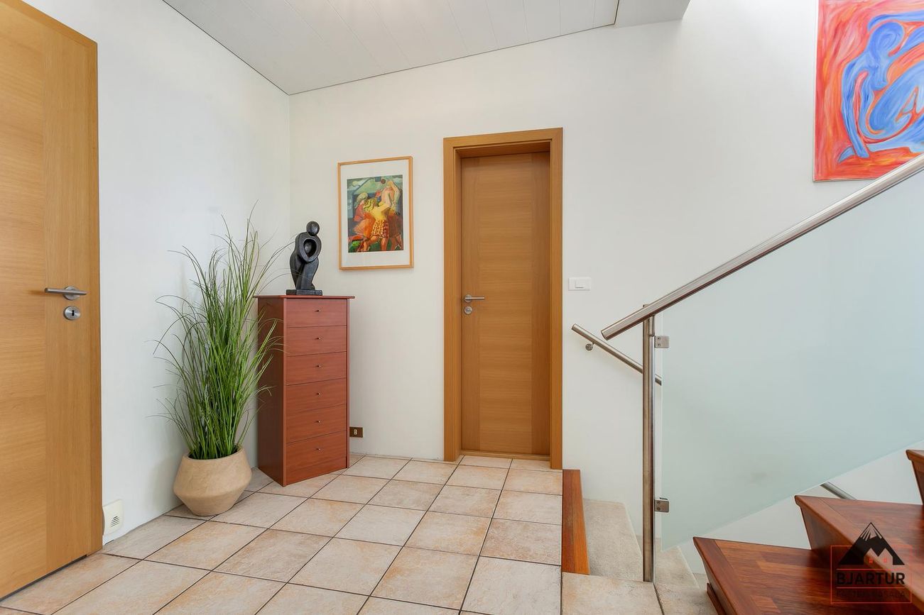 Úr holi er einnig gengið upp á efri og neðri palla hússins. Þrjú parketlögð þrep eru upp á efri pallinn og teppalagður stigi liggur niður á neðsta pallinn. Stigahandriðin eru úr burstuðu stáli og sandblánu öryggisgleri. Eldhús með ljósri innréttingu, flísum á milli skápa og góðum borðkrók.