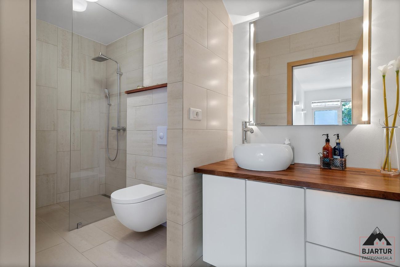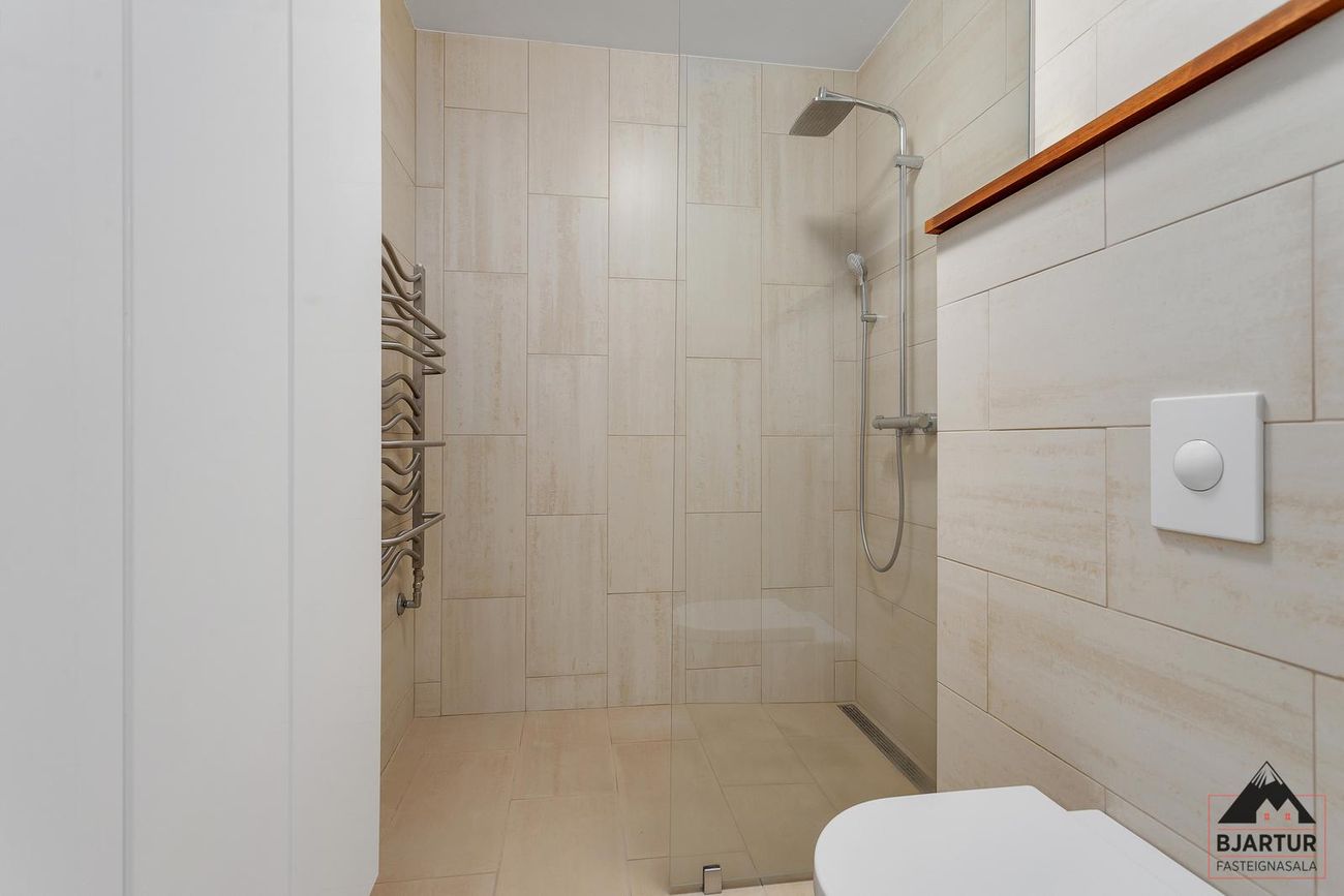 Baðherbergi flísalagt í hólf og gólf með upphengdu salerni, góðum skápum, „walk in“ sturtu og gólfhita.