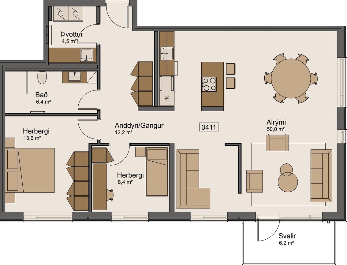 Allar íbúðir skilast fullbúnar með gólfefnum. Auk þess fylgir öllum íbúðum vönduð heimilistæki, með inniföldum ísskáp og uppþvottavél.