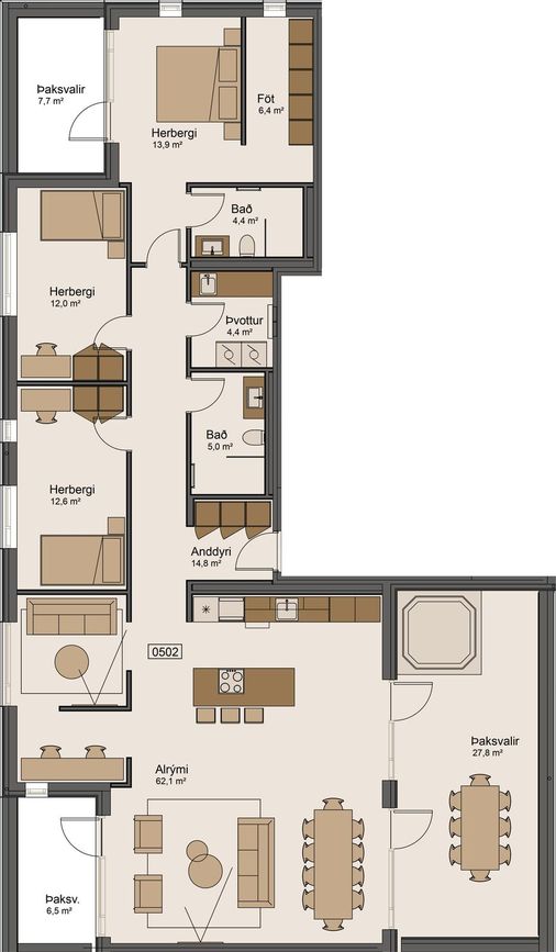 Nánar um eign: Íbúð 502, Stefnisvogur 34:Eignin er 4 herbergja herbergja íbúð á 5. hæð, merkt (0502), birt stærð íbúðar 160,2 fm. Eigninni tilheyrir geymsla í kjallara merkt 0017, birt stærð 16,5 fm.