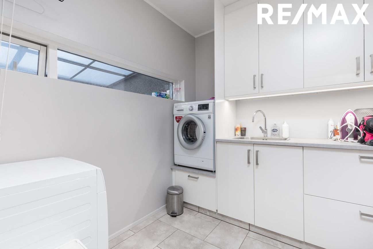 Þvottahús er flísalagt, hvít innrétting með vaski, upphækkun fyrir þvottavél, gott skápapláss, gluggi