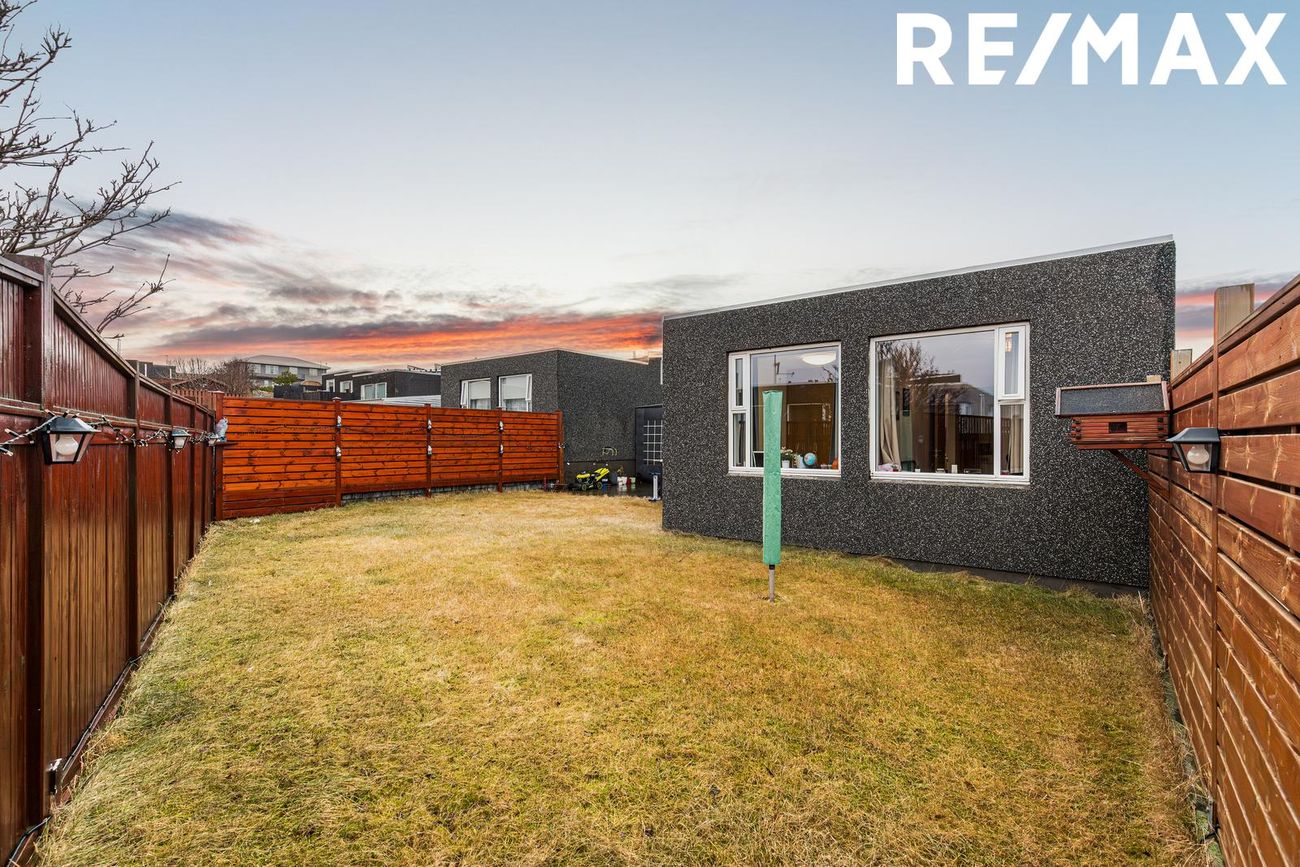 Baklóðin er afgirt, grasilögð, komnar lagnir fyrir heitan pott, fín grill og sólbaðs verönd yfirbyggð og aflokuð að hluta með pergola.