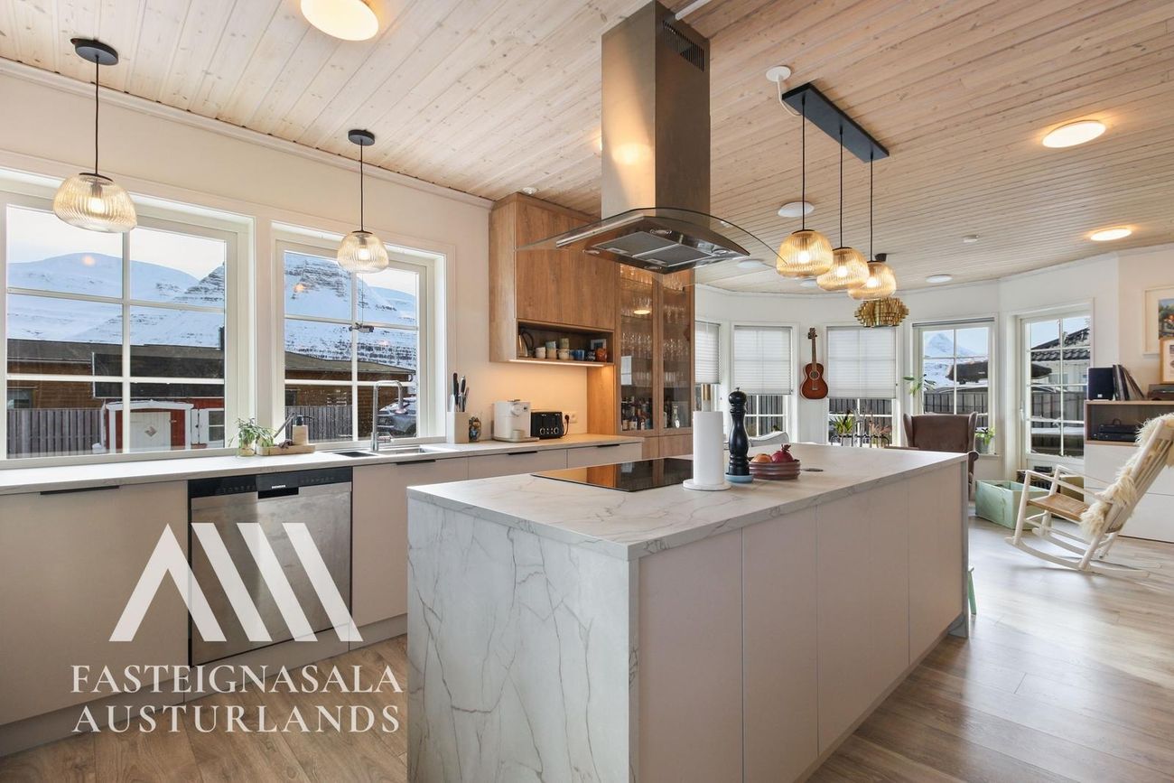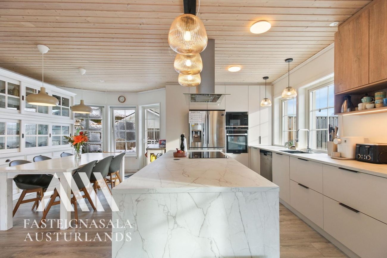 Eldhús: Klárað sumarið 2025 með fallegri innréttingu frá Brúnás. Stór eyja með fallegri borðplötu, ríflegt skápapláss og vönduð tæki.
