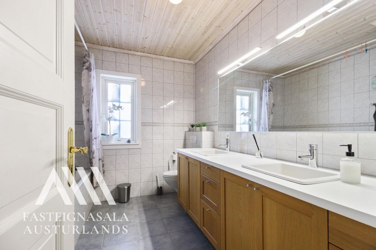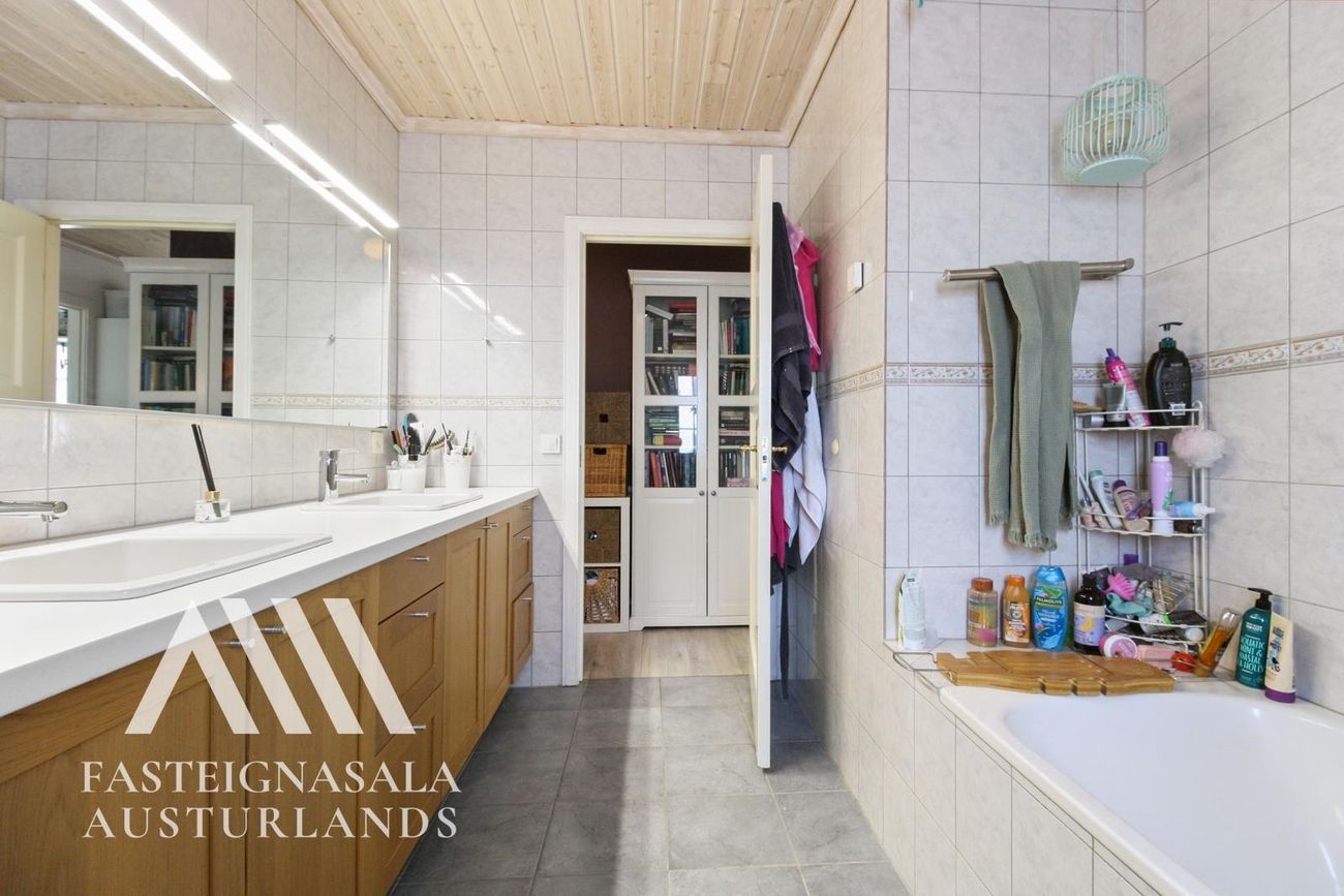 Aðal baðherbergi: Flísalagt í hólf og gólf. Stór viðarinnrétting með tveimur vöskum, baðkar, sturtuaðstaða og ný blöndunartæki.