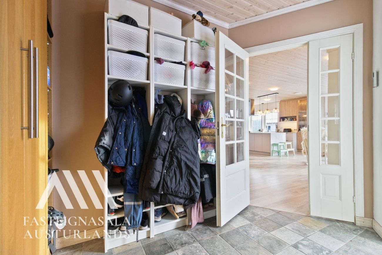 Einstaklega vel viðhaldið fjölskylduhús á frábærum stað!Forstofa: Flísalögð (2021) með opinni fataaðstöðu. Þaðan er gengið inn í alrýmið um fallegar, tvöfaldar glerhurðir eða inn á gang á vinstri hönd.