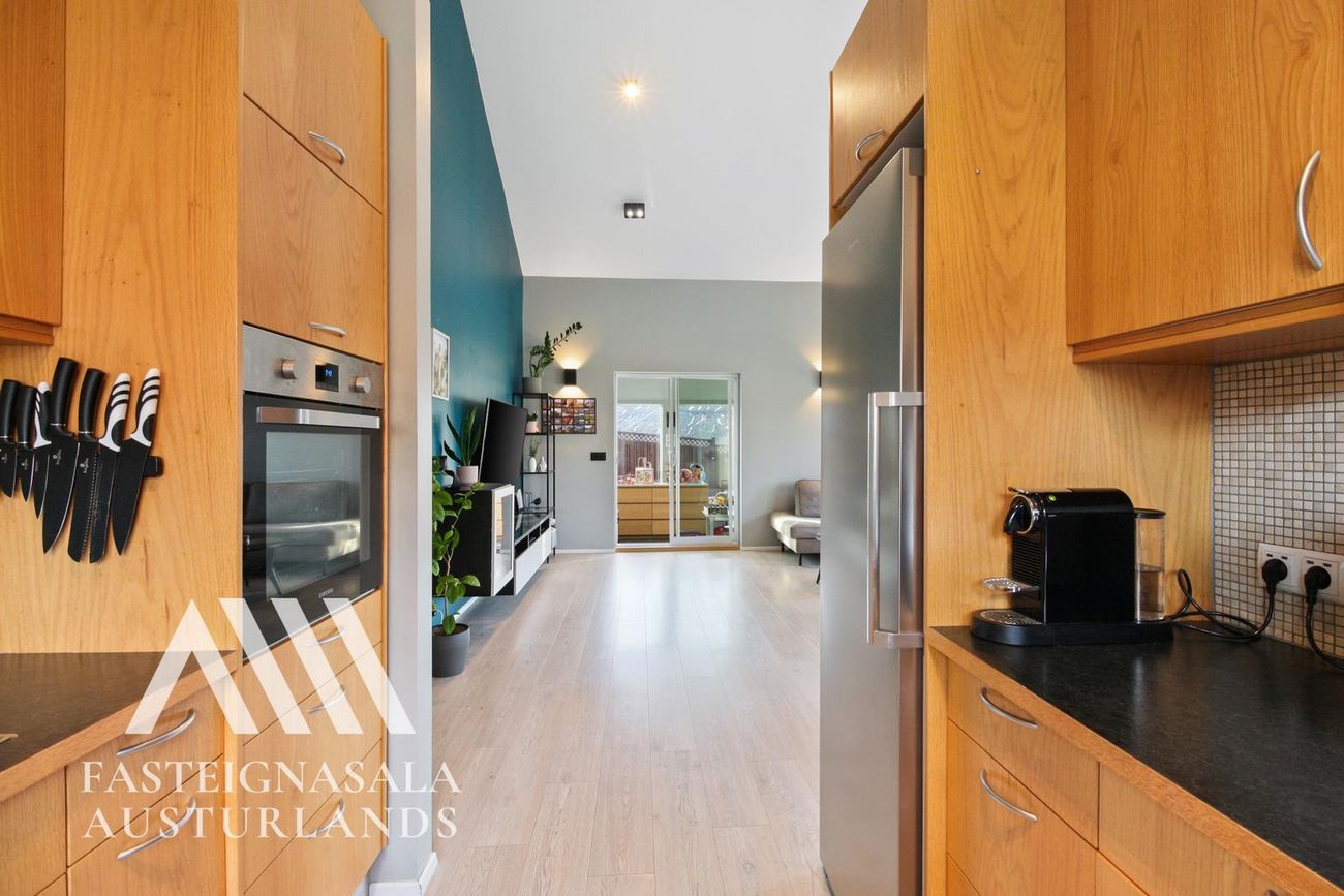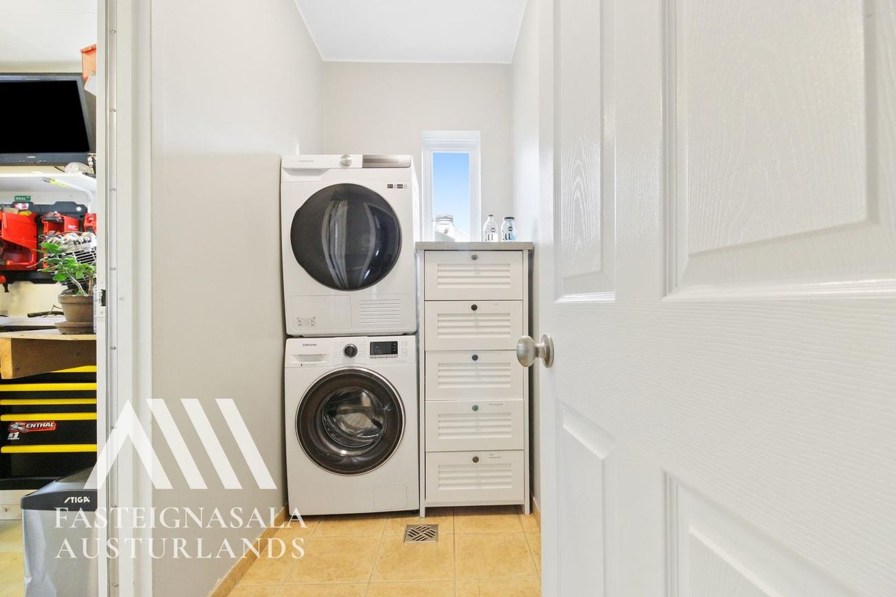 Bílskúr: Við hlið þvottahús og innangengt þar á milli. Snyrtilegur og vel skipulagður með auka geymslulofti.