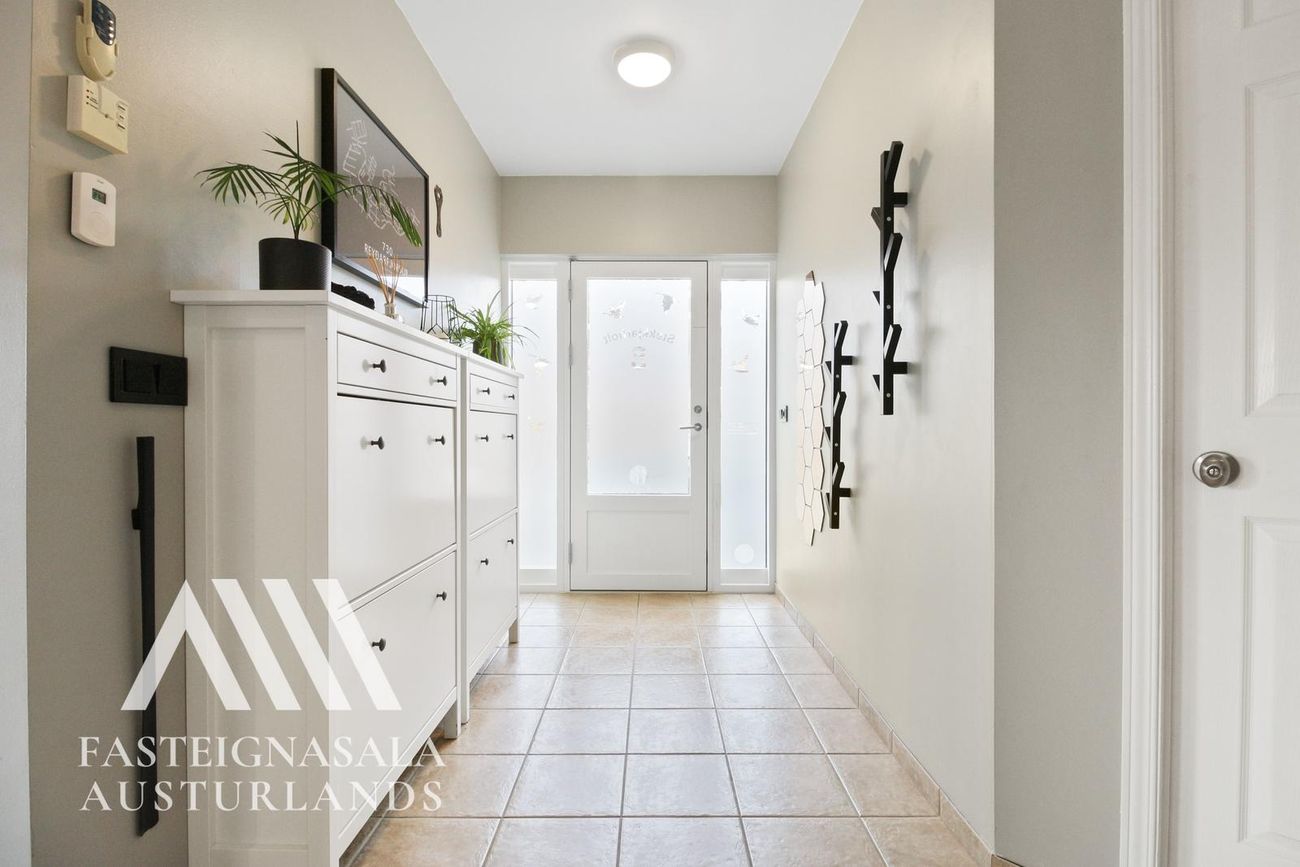 Rúmgott fjölskylduhús á frábærum stað!Forstofa: Rúmgóð með fallegum flísum á gólfi og tvöföldum fataskáp.