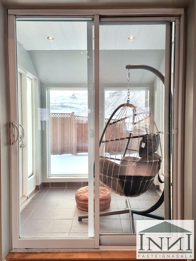Eldhús: Er inn af alrými. U-laga innrétting, sæmilega rúmgóð með björtum glugga og útsýni.