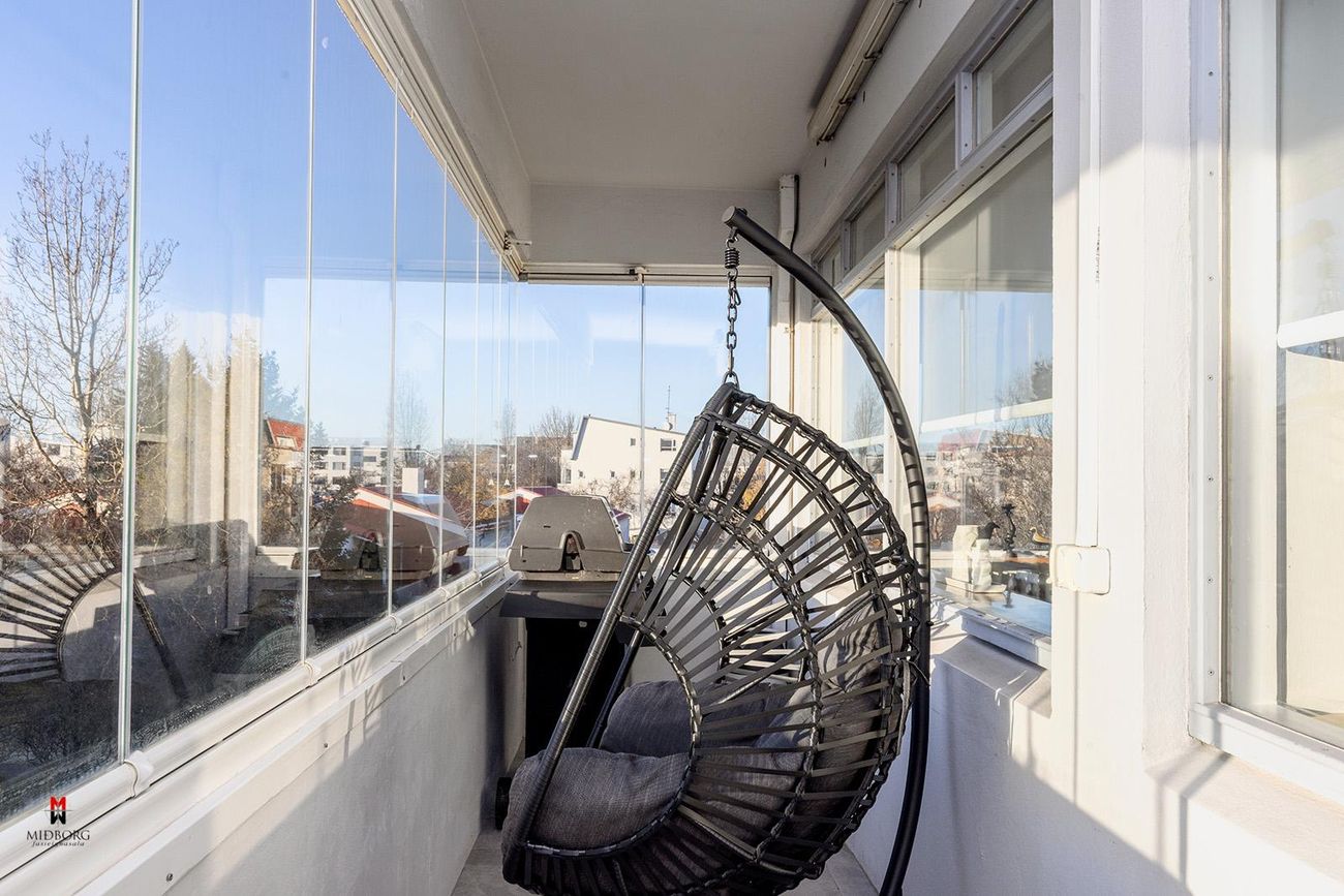 12 fm. flísalagaðar suðursvalir með svalalokun og rafmagnstenglum.