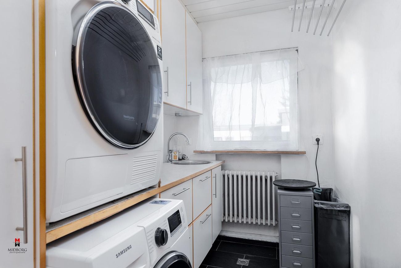 Flísalagt þvottahús með innréttingu, skolvaski og innisnúrum.