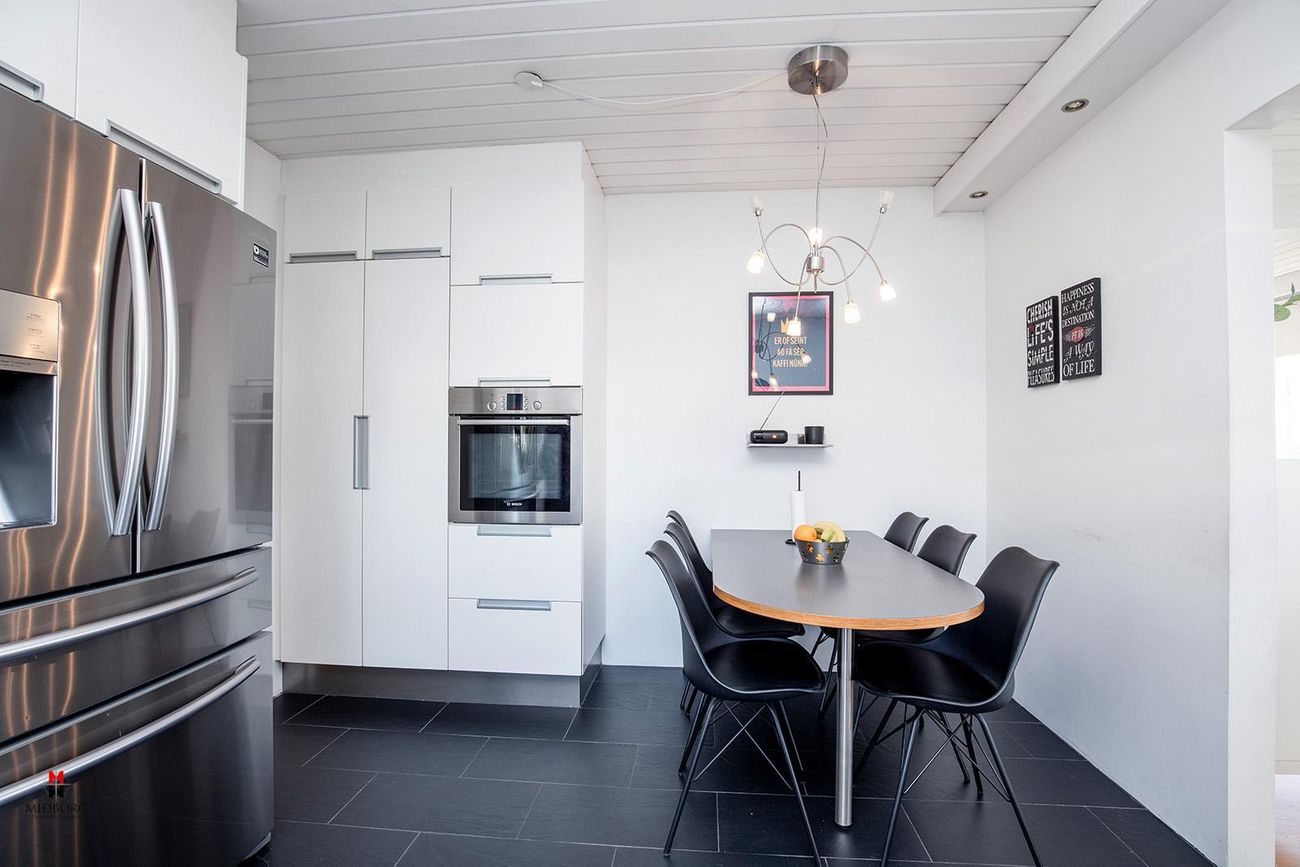 Uppþvottavél, ofn, tvöfaldur ísskáp, skolvaskur og innisnúr.