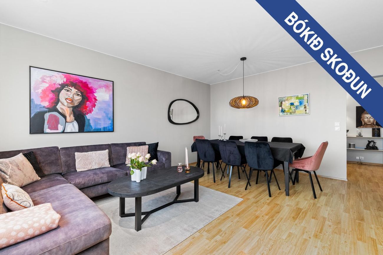 Stofa / borðstofa er björt og rúmgóð með harðparketi á gólfi. Útgengt er úr stofu á rúmgóðar svalir.