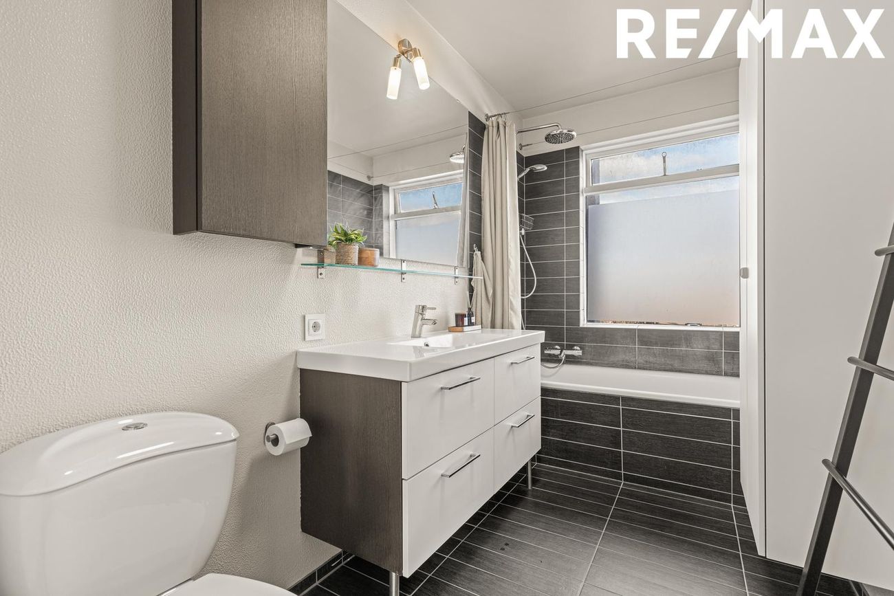 Baðherbergi með baðkari, sturtuaðstöðu, skáp og opnanlegum glugga. Flísar á gólfi og við baðkar.