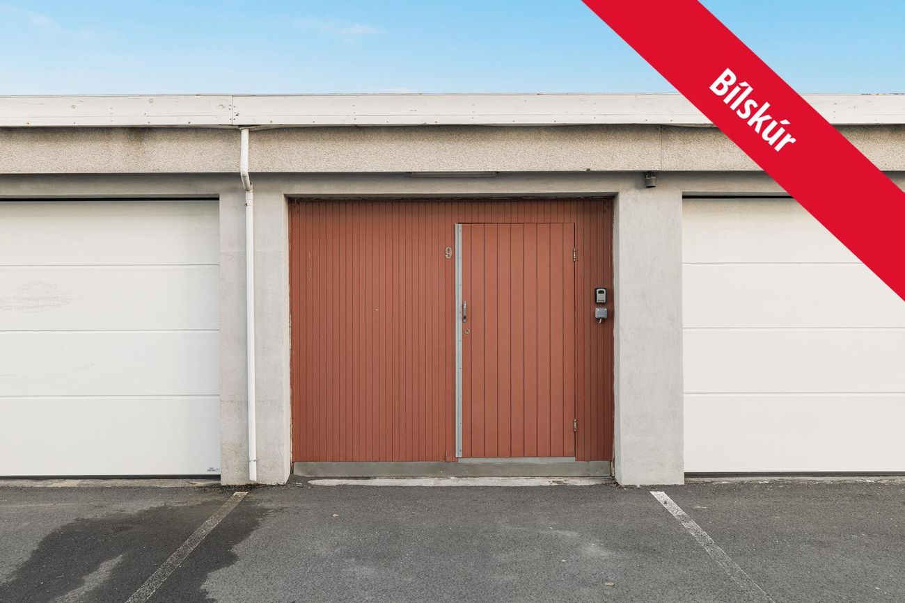 Bílskúr með heitu, kaldu og rafmagni. Flísalagður með veðurhlífum á norðurhlið (2017) og rafhleðslustöð.