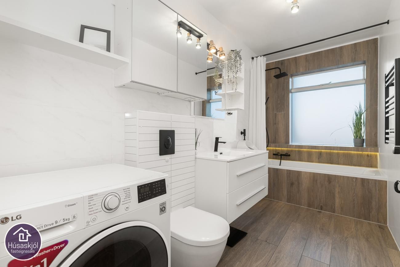 Baðherbergi með flísum á gólfi og upp á veggi, baðkari með sturtuaðstöðu og tengi fyrir þvottavél og þurrkara, handklæðaofn, þvagskál
