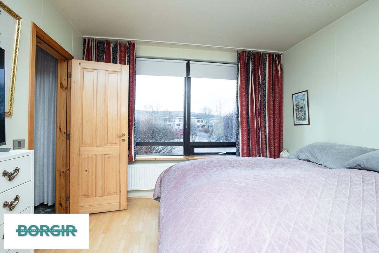 Svefnherbergi: Með fjórföldum fataskáp, stórum glugga, parketi á gólfi. Hægt er að ganga inní herbergið frá baðherbergi og stofu.
