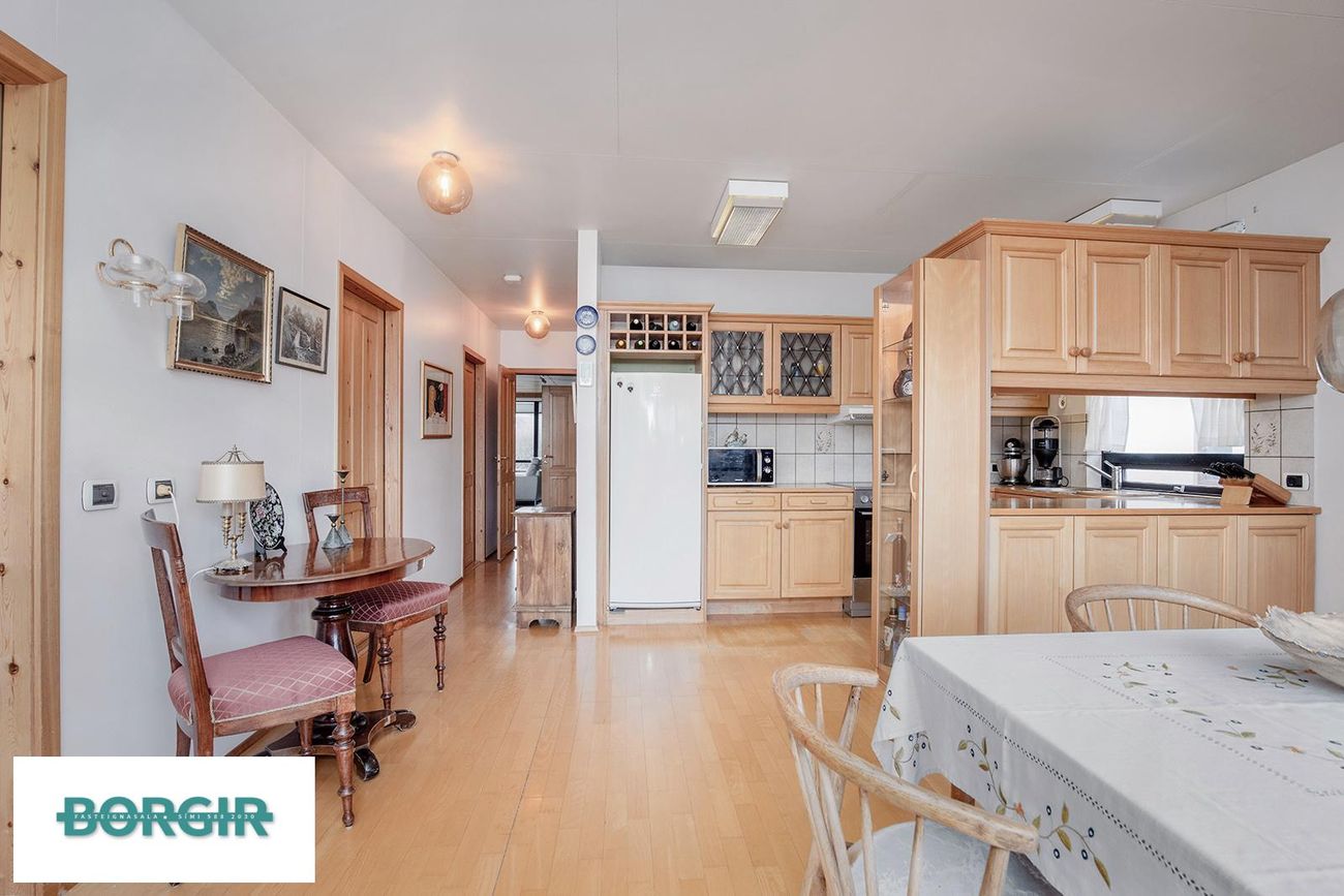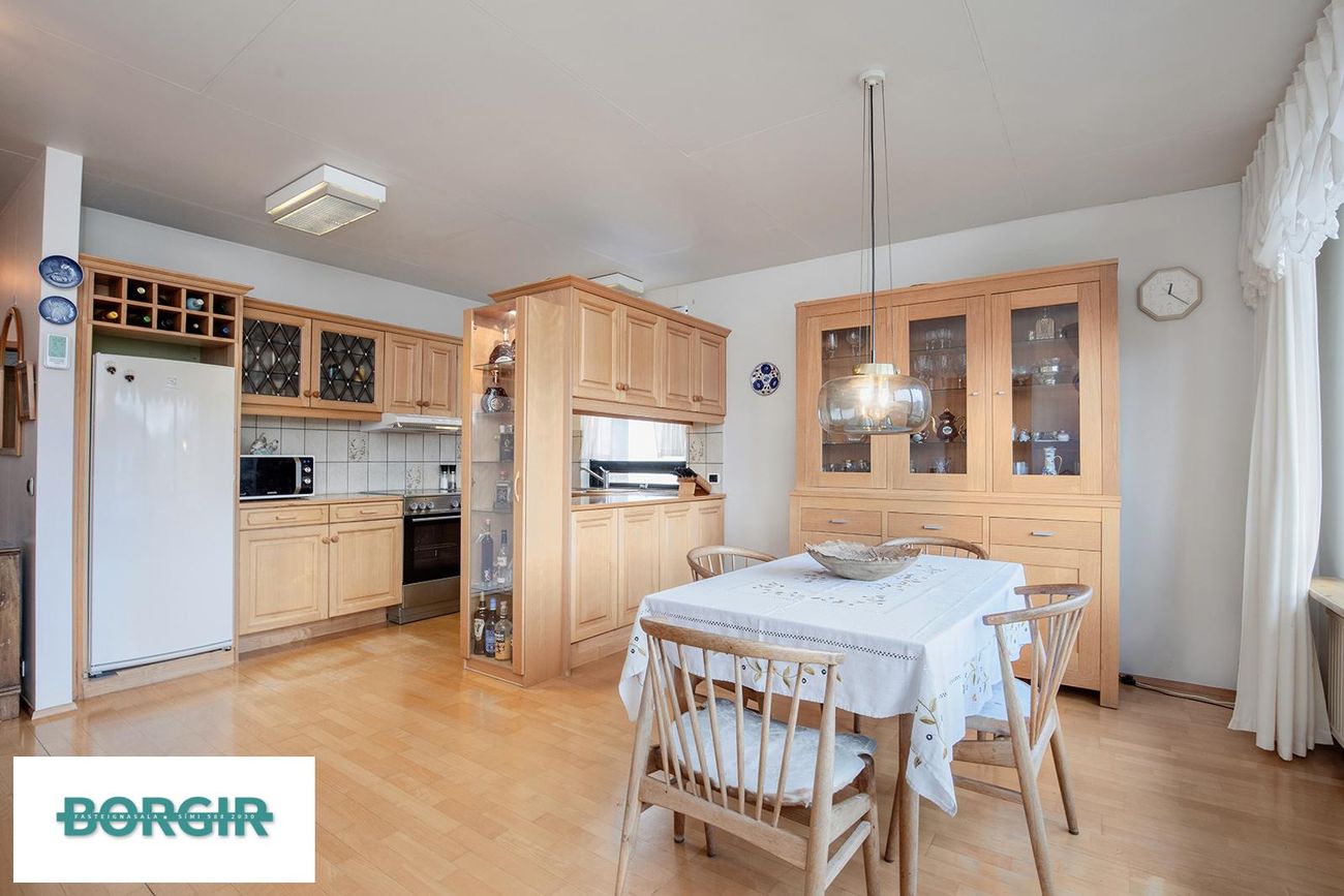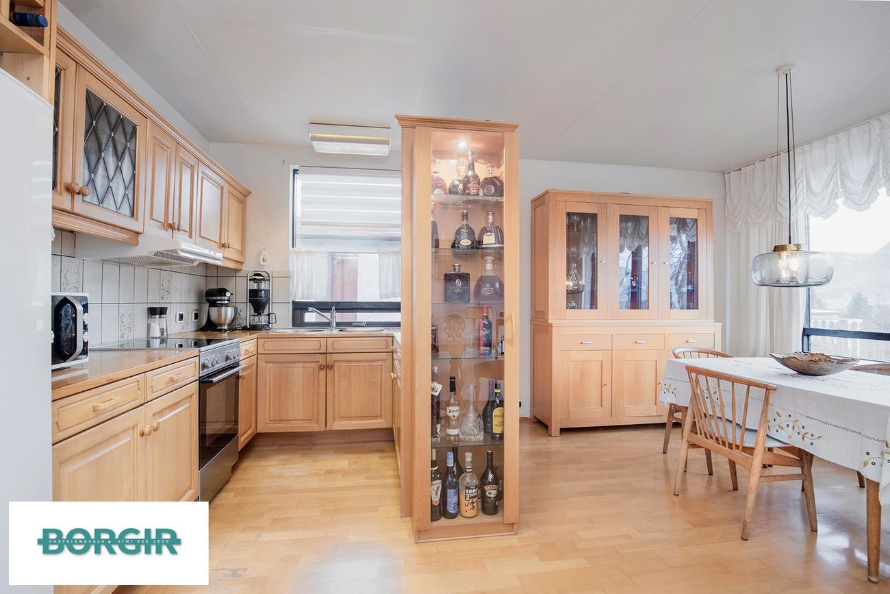 Eldhús: Stórt eldhús með nýlegri eldavél, stórum borðkrók og stórum gluggum.