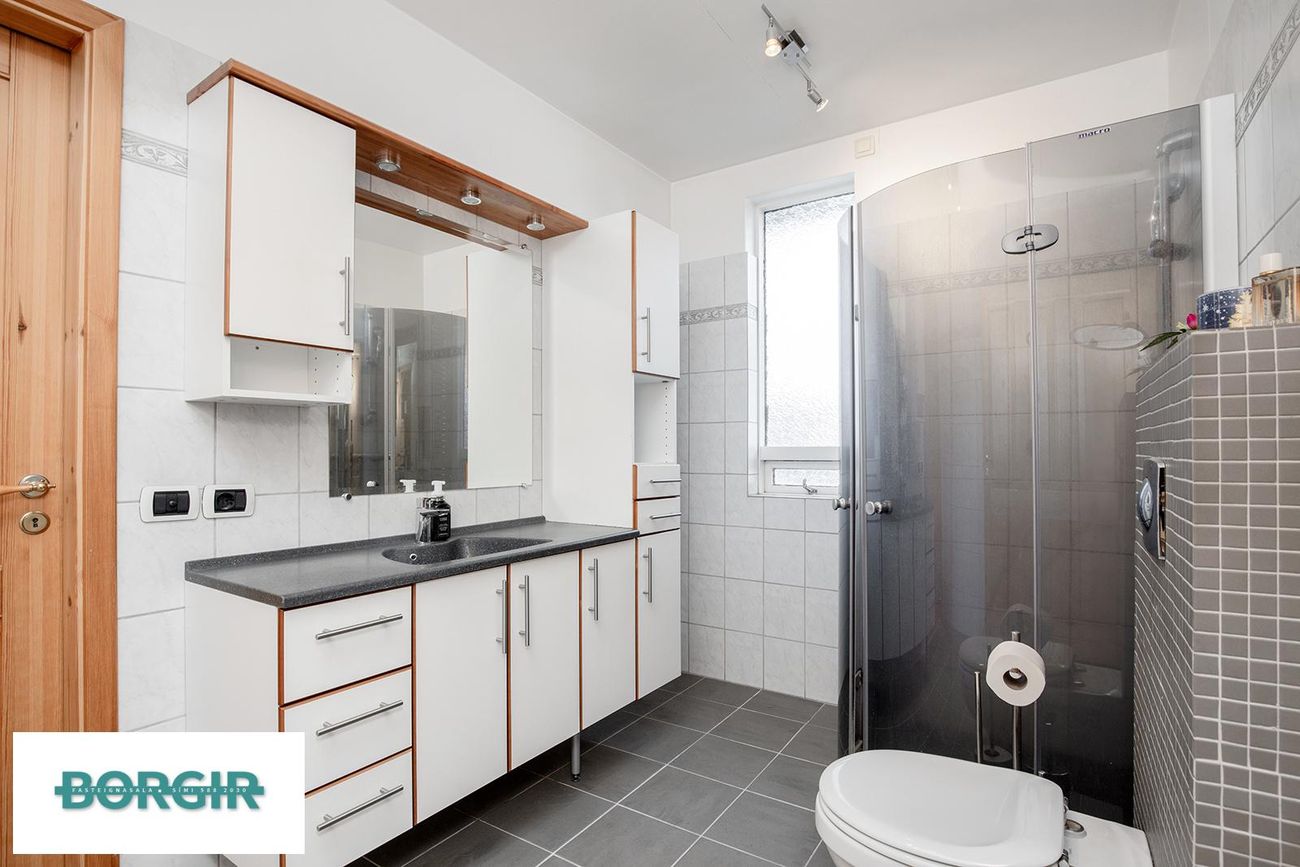 Baðherbergi I: Með sturtuklefa, salerni og vaskaskáp, flísar á gólfi og veggjum.