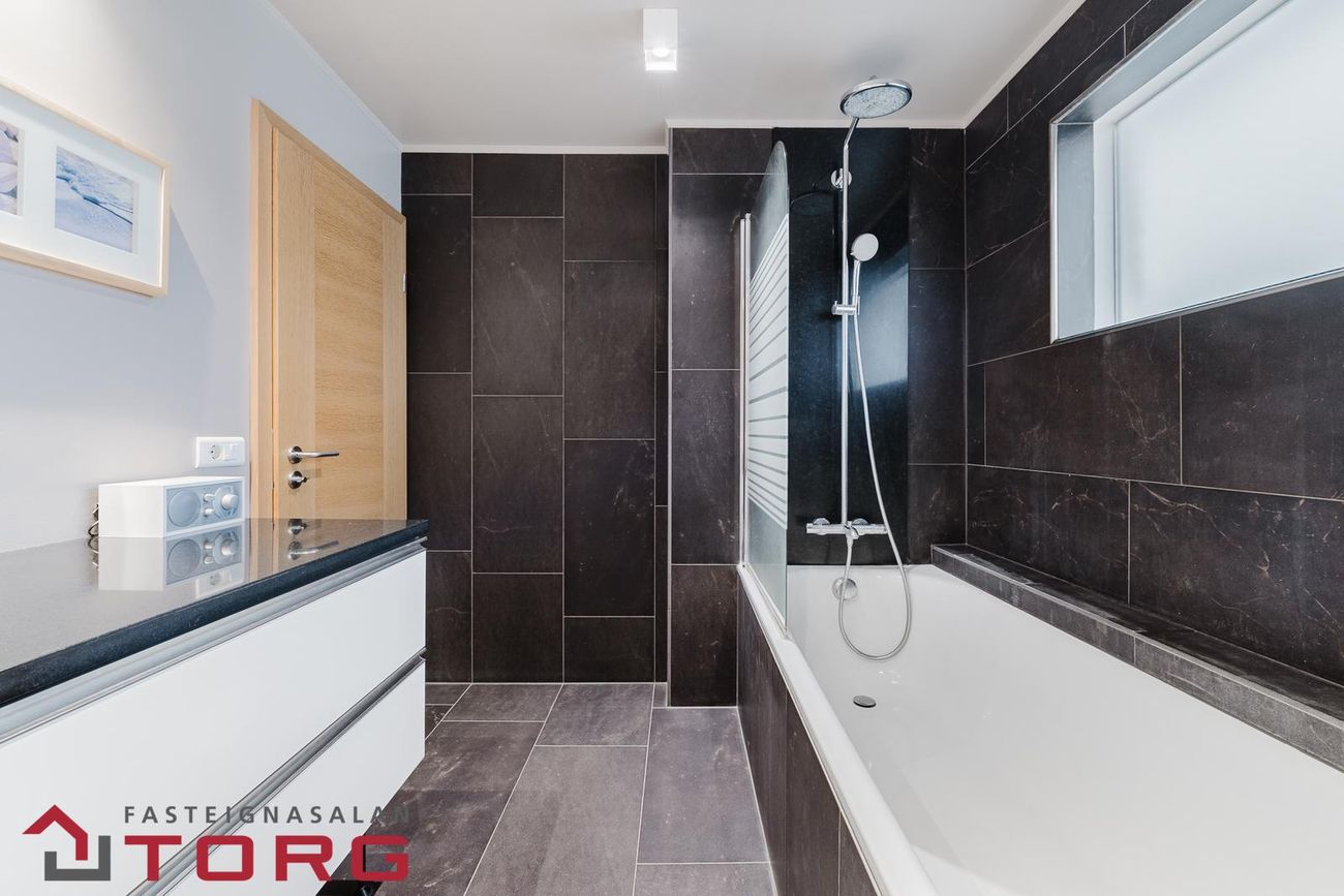 Allar innréttingar og skápar eru í stíl, svart granít í eldhúsi, baðherbergi og í gluggakistum.