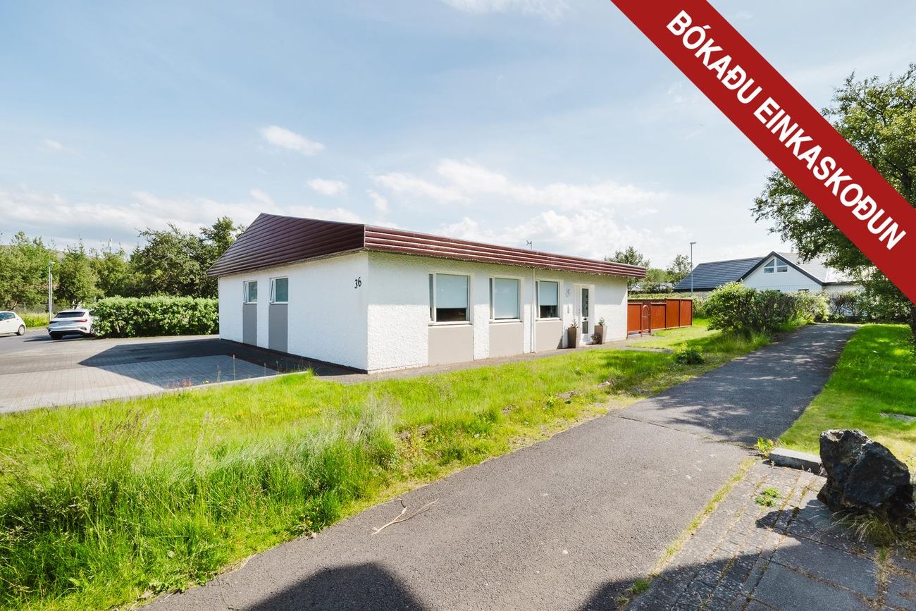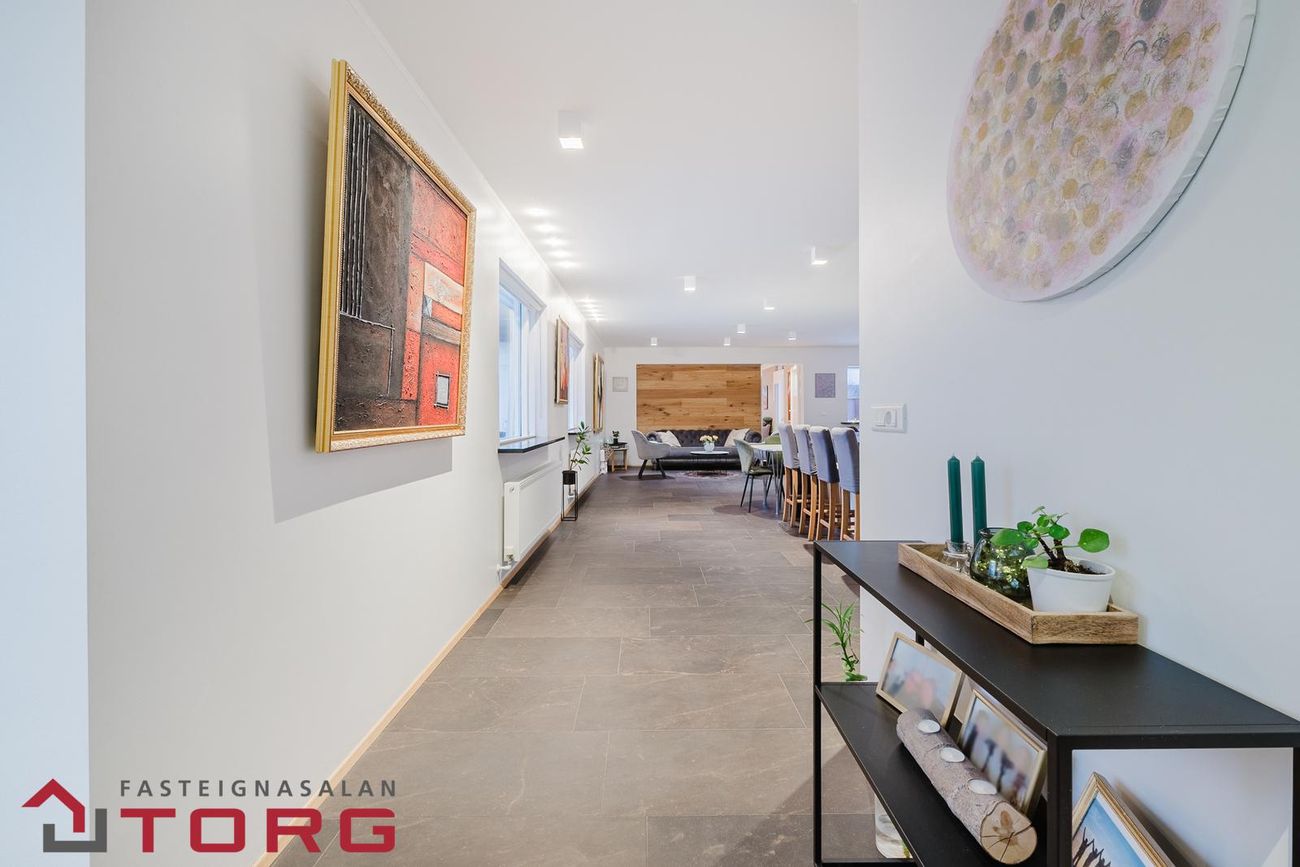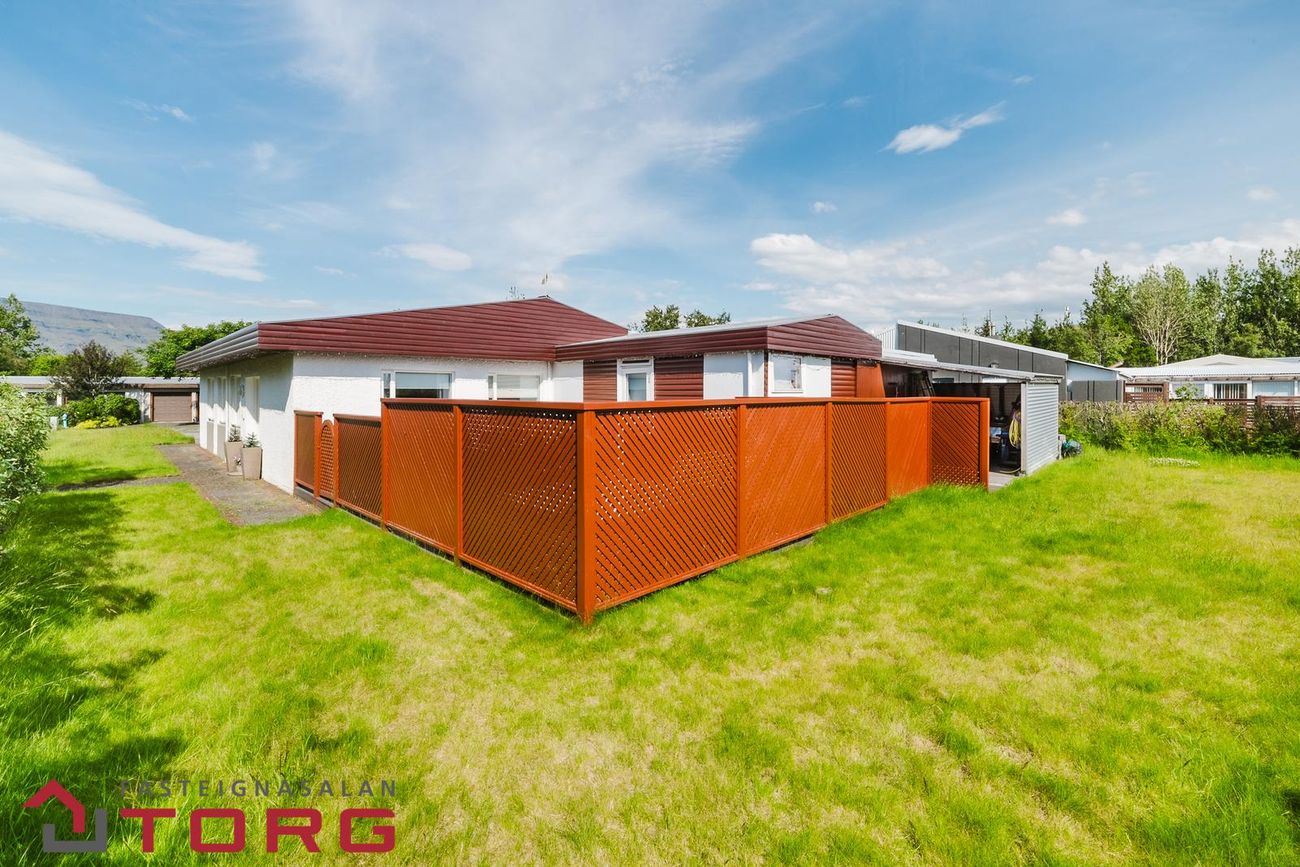 Guðný Ösp lgf. s. 665-8909 og fasteignasalan Torg kynnir glæsilegt einbýlishús á einni hæð ásamt bílskúr við Stórateig 36 í Mosfellsbæ***Seljendur skoða uppítöku á minni eign, einbýli eða rað-parhúsi*** Fasteignamat ársins 2026 verður 135.750.000,-Eignin sem um ræðir er skv., yfirliti HMS skráð 211,7 m2 en þar af er bílskúr skráður 40,6 m2. Um er að ræða vel skipulagt einbýlishús á einni hæð með þremur til fjórum svefnherbergjum. Búið er að breyta 31 m2 rými í húsinu sem skráð er sólstofa í íbúðarrými sem getur verið nýtt sem stofa eða rúmgott herbergi. Komið er inn í forstofu, til beggja hliða við hana eru herbergi. Borðstofa-, stofa og eldhús í opnu, björtu og samhliggjandi rými. Gangur liggur að hjónasvítu með rúmgóðu fataherbergi. Aðalbaðherbergi er staðsett fyrir enda gangsins. Innangengt í bílskúr úr sjónvarpsherbergi og út á pall. Eldhús er með góðu vinnuplássi og stórri frístandandi eyju sem er með svartri granít borðplötu. Frá eldhúsi er lítið hol með fataskápum og þvottahús sem jafnframt er með salerni.