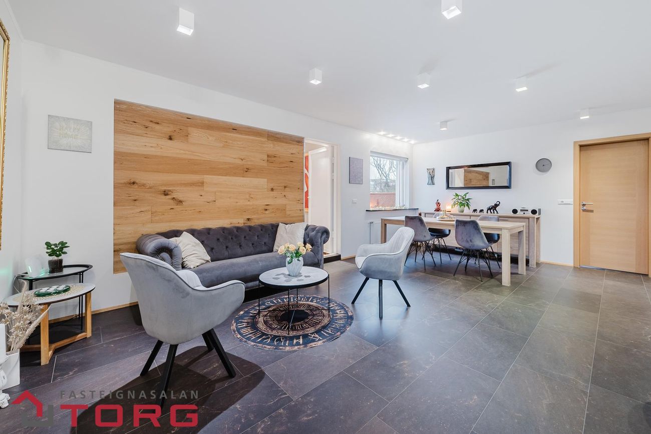 Stofa-og borðstofa: flísar á gólfi.