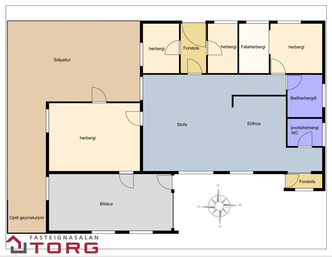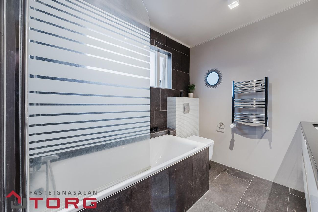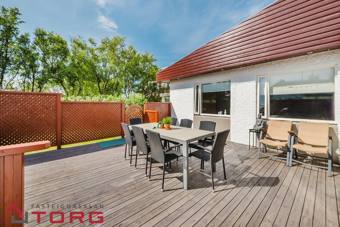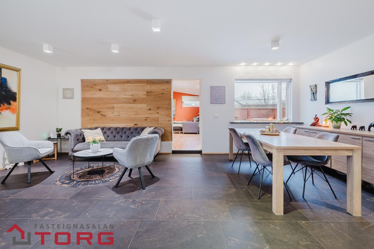 Guðný Ösp lgf. s. 665-8909 og fasteignasalan Torg kynnir glæsilegt einbýlishús á einni hæð ásamt bílskúr við Stórateig 36 í Mosfellsbæ***Seljendur skoða uppítöku á minni eign, einbýli eða rað-parhúsi*** Eignin sem um ræðir er skv., yfirliti HMS skráð 211,7 m2 en þar af er bílskúr skráður 40,6 m2. Um er að ræða vel skipulagt einbýlishús á einni hæð með þremur til fjórum svefnherbergjum. Búið er að breyta 31 m2 rými í húsinu sem skráð er sólstofa í íbúðarrými sem getur verið nýtt sem stofa eða rúmgott herbergi. Komið er inn í forstofu, til beggja hliða við hana eru herbergi. Borðstofa-, stofa og eldhús í opnu, björtu og samhliggjandi rými. Gangur liggur að hjónasvítu með rúmgóðu fataherbergi. Aðalbaðherbergi er staðsett fyrir enda gangsins. Innangengt í bílskúr úr sjónvarpsherbergi og út á pall. Eldhús er með góðu vinnuplássi og stórri frístandandi eyju sem er með svartri granít borðplötu. Frá eldhúsi er lítið hol með fataskápum og þvottahús sem jafnframt er með salerni.