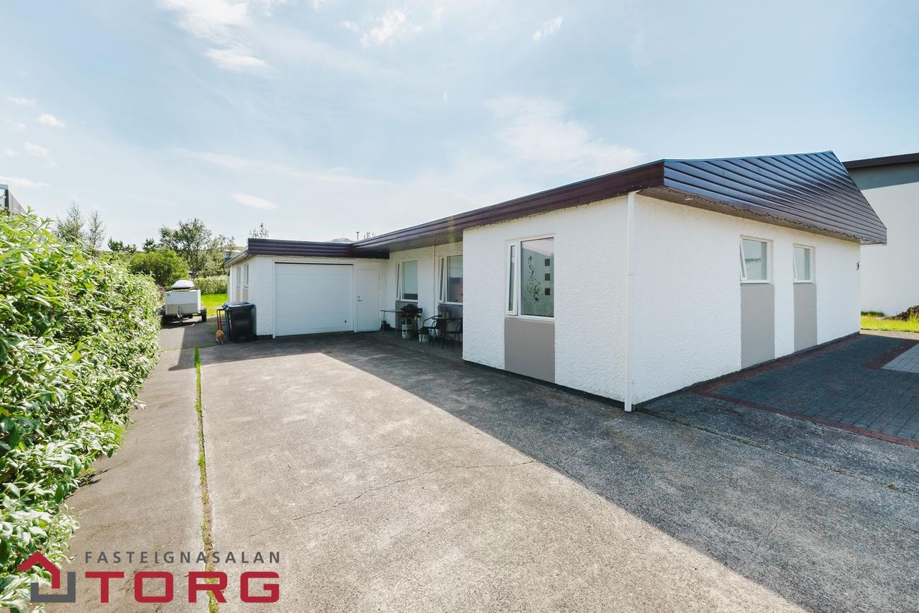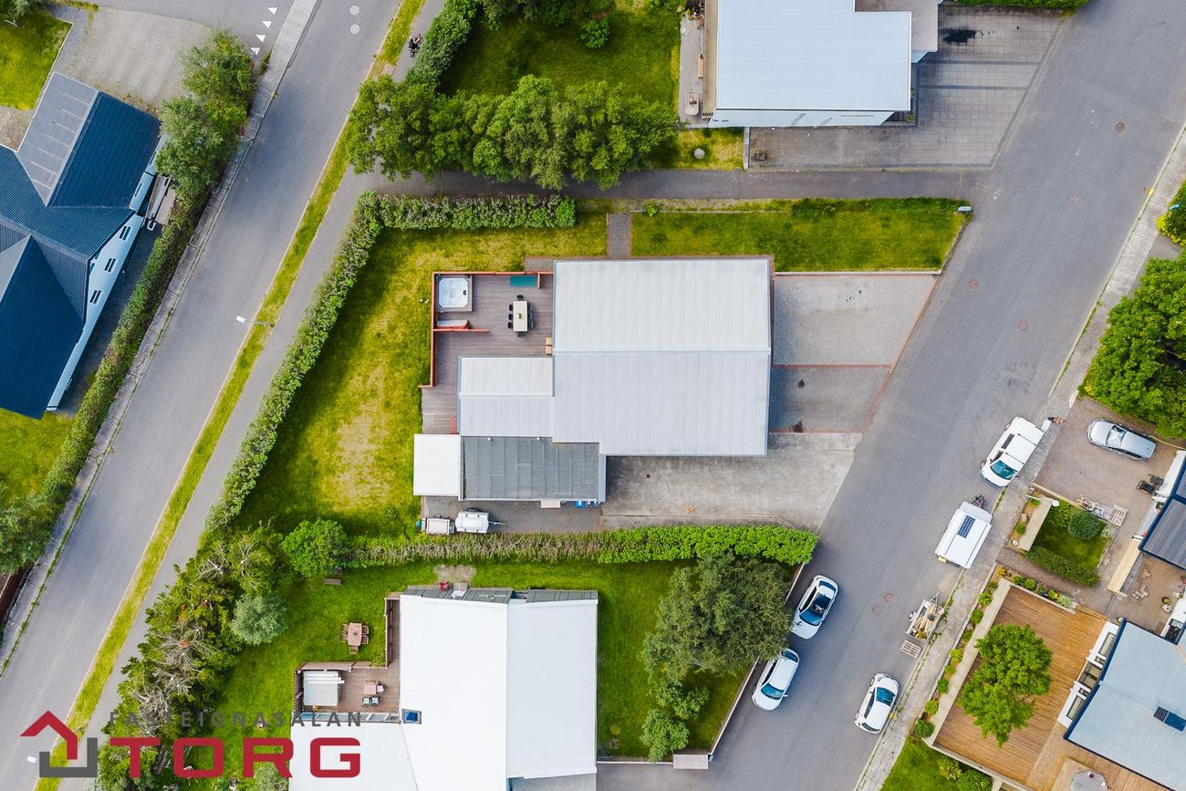 Planið fyrir framan húsið er rúmgott, getur rúmað allt að 8 bifreiðar og þægileg aðkoma að bílskúr á vinstri hlið hússins séð út frá götu.