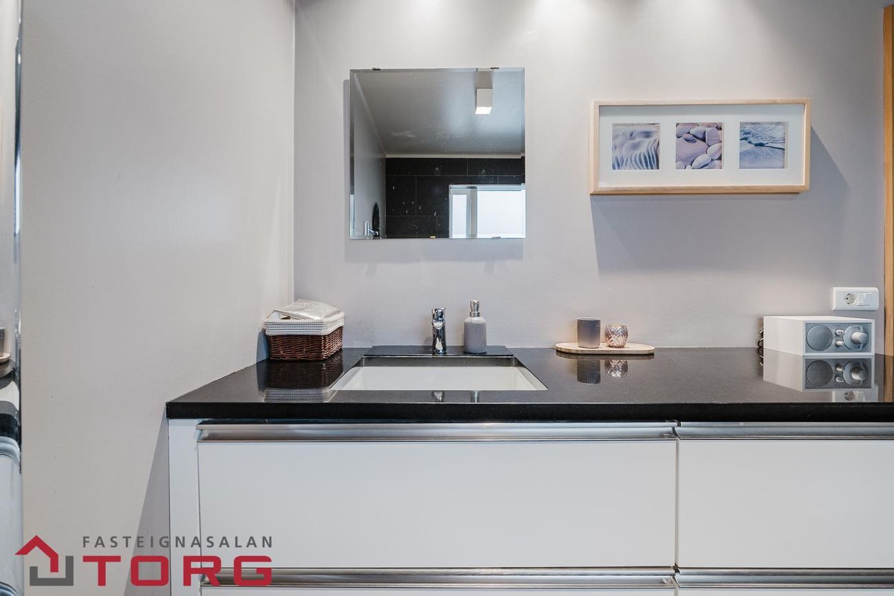 Allar innréttingar og skápar eru í stíl, svart granít í eldhúsi, baðherbergi og í gluggakistum.