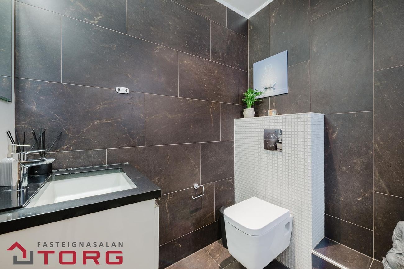 Þvottahús: flísar á gólfi, innrétting fyrir þvottavél- og þurrkara, upphengt salerni og handlaug.