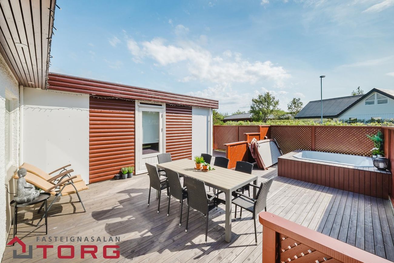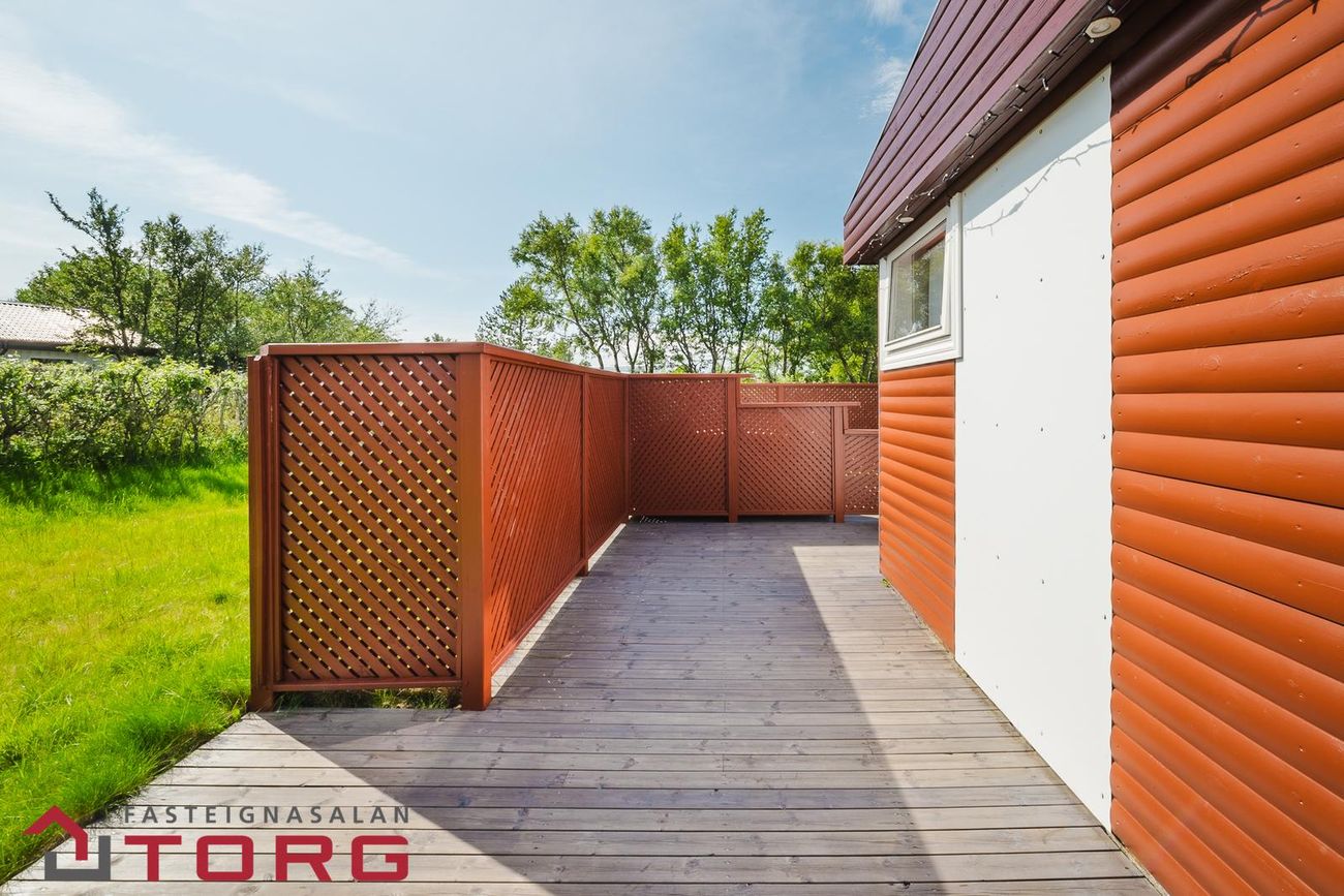 Garðurinn umhverfis húsið er rúmgóður, pallur með heitum potti og skjólveggjum sem snýr í suð-vestur.