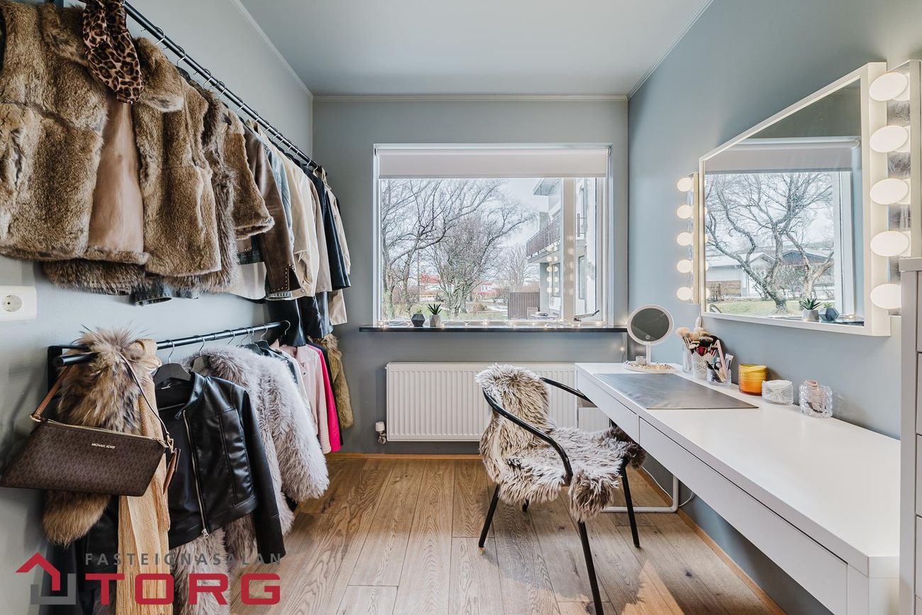 Hol: flísar á gólfi og rúmgóðir fataskápar, þaðan er útgengt að plani framan við bílskúr.