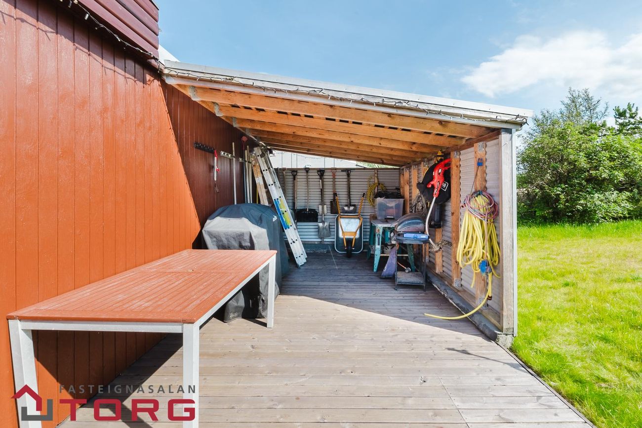 Garðurinn umhverfis húsið er rúmgóður, pallur með heitum potti og skjólveggjum sem snýr í suð-vestur.