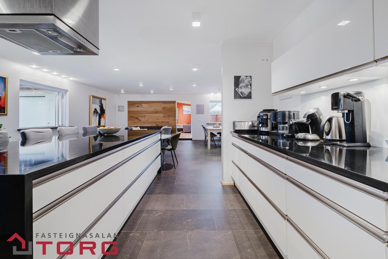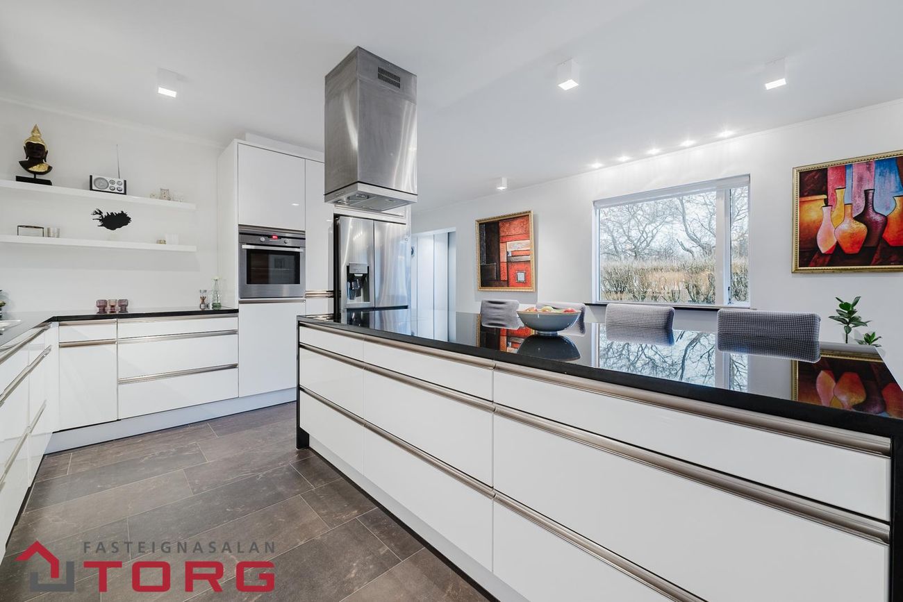 Eldhús: flísar á gólfi, hvít eldhúsinnrétting með svörtum granít borðplötum og stórri frístandandi eyju með svartri granít borðplötu með góðu vinnuplássi.