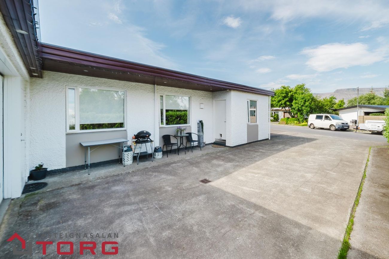 Planið fyrir framan húsið er rúmgott, getur rúmað allt að 8 bifreiðar og þægileg aðkoma að bílskúr á vinstri hlið hússins séð út frá götu.