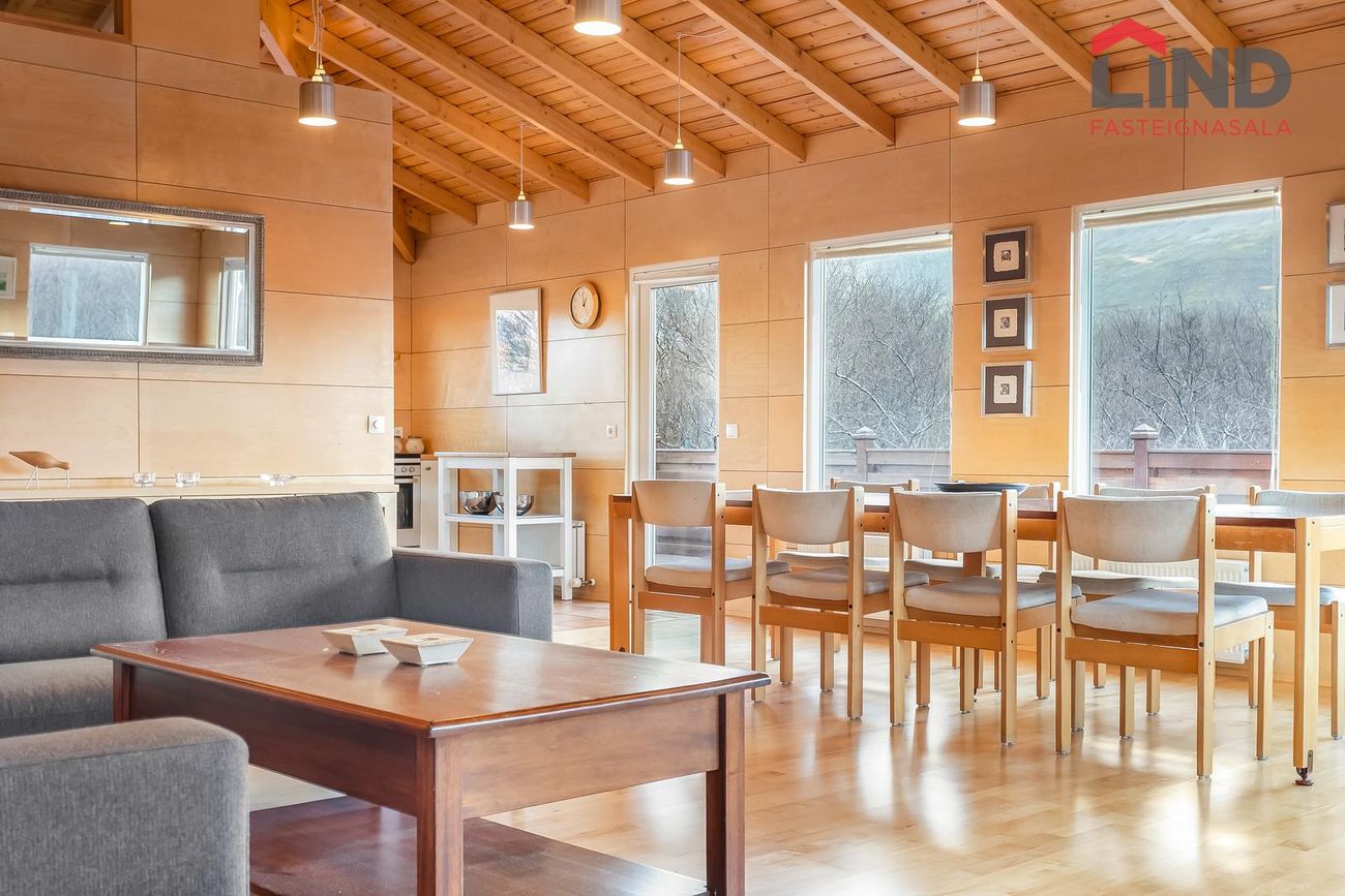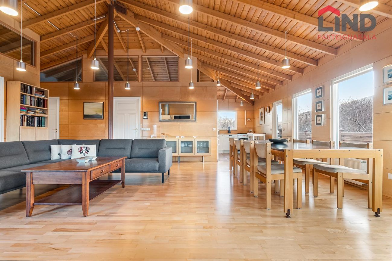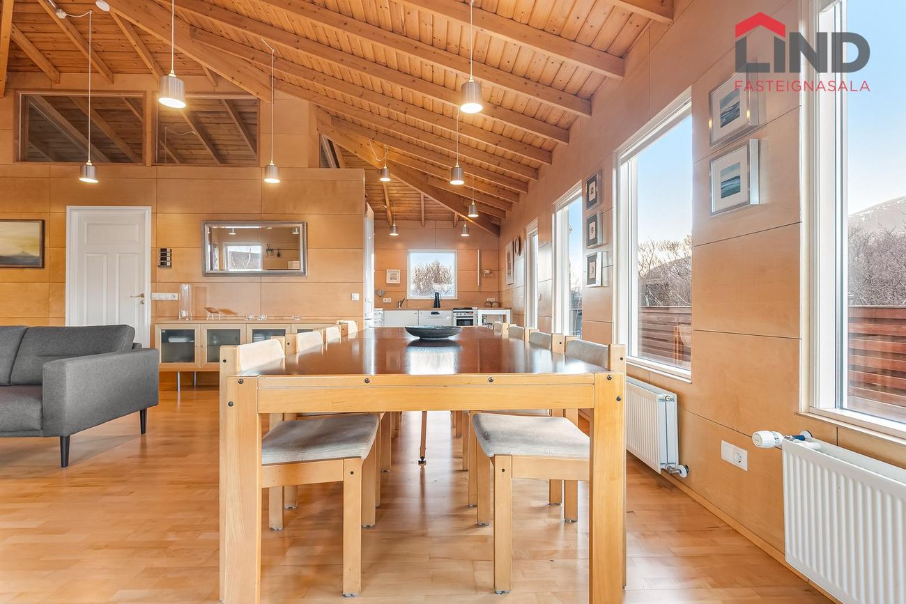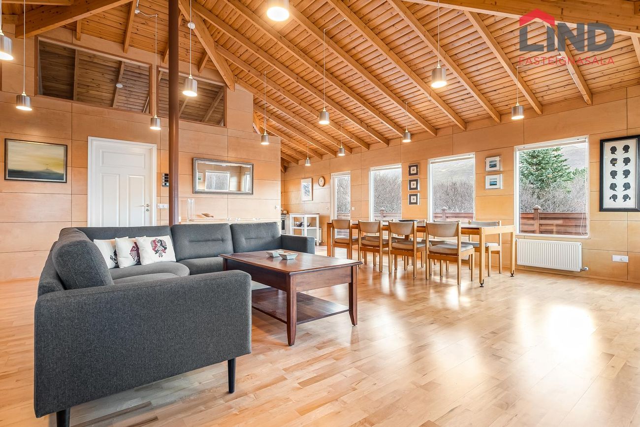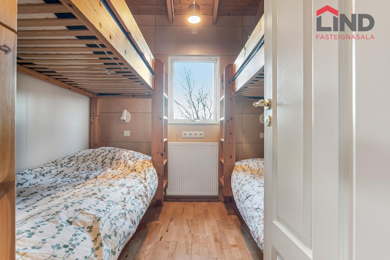 Nánari lýsing Forstofa með flísum á gólfi Eldhús með parketi á gólfi og eldhúsinnréttingu með nýrri uppþvottavél, eldavél, ísskápi með frysti, örbylgjuofni og færanlegri eyju. Stofa-borðstofa með parketi á gólfi, hátt til lofts, stórt nýtt sófasett ásamt stóru borðstofusetti sem rúmar 12-14 manns. Þrjú svefnherbergi, eitt af þeim er með tveimur kojum. Tvö nýleg amerísk rúm og góðar og þykkar svampdýnur í kojunum. Baðherbergi með flísalögðu gólfi, góðri sturtu, þvottavél og þurrkara. Geymsla með hillum.