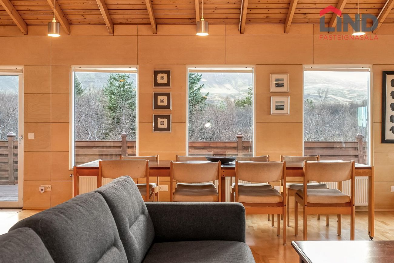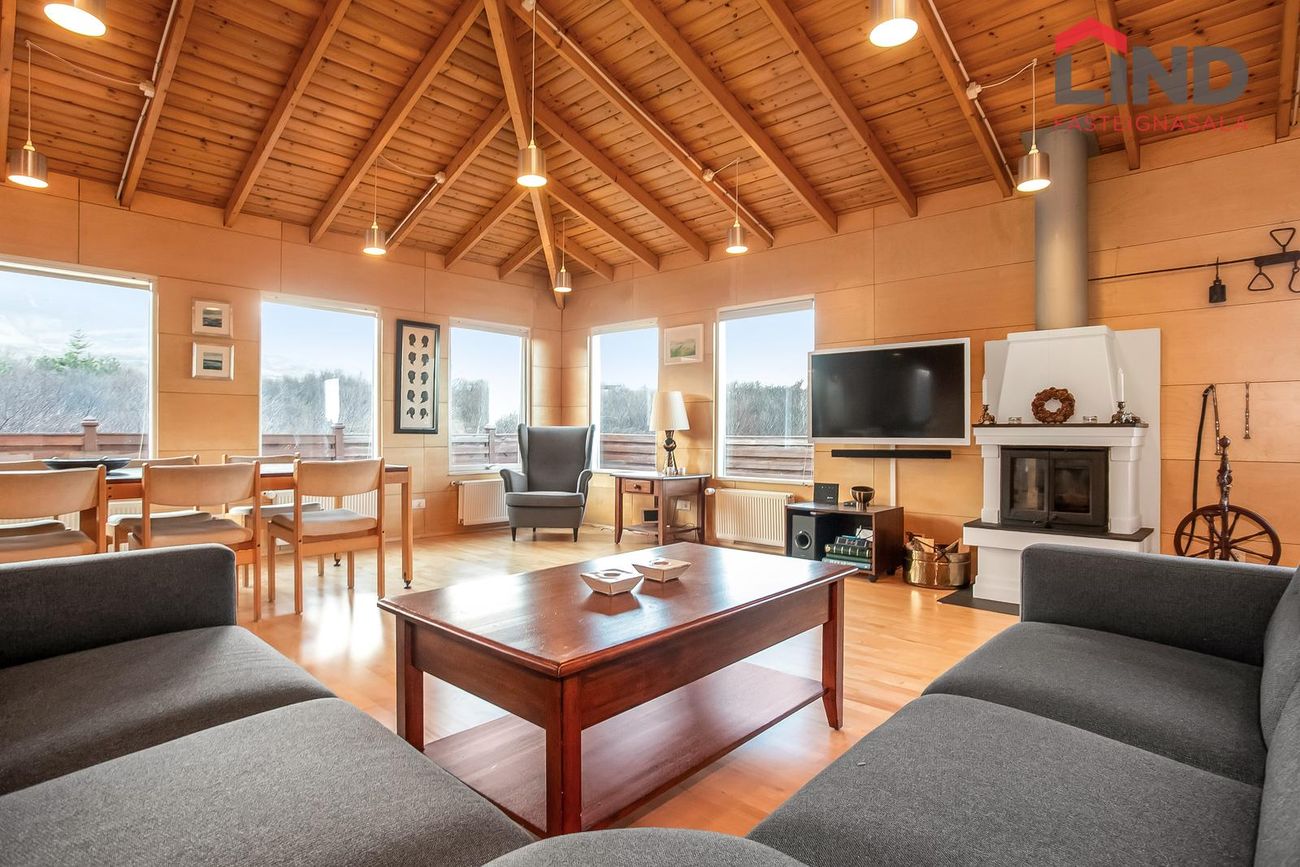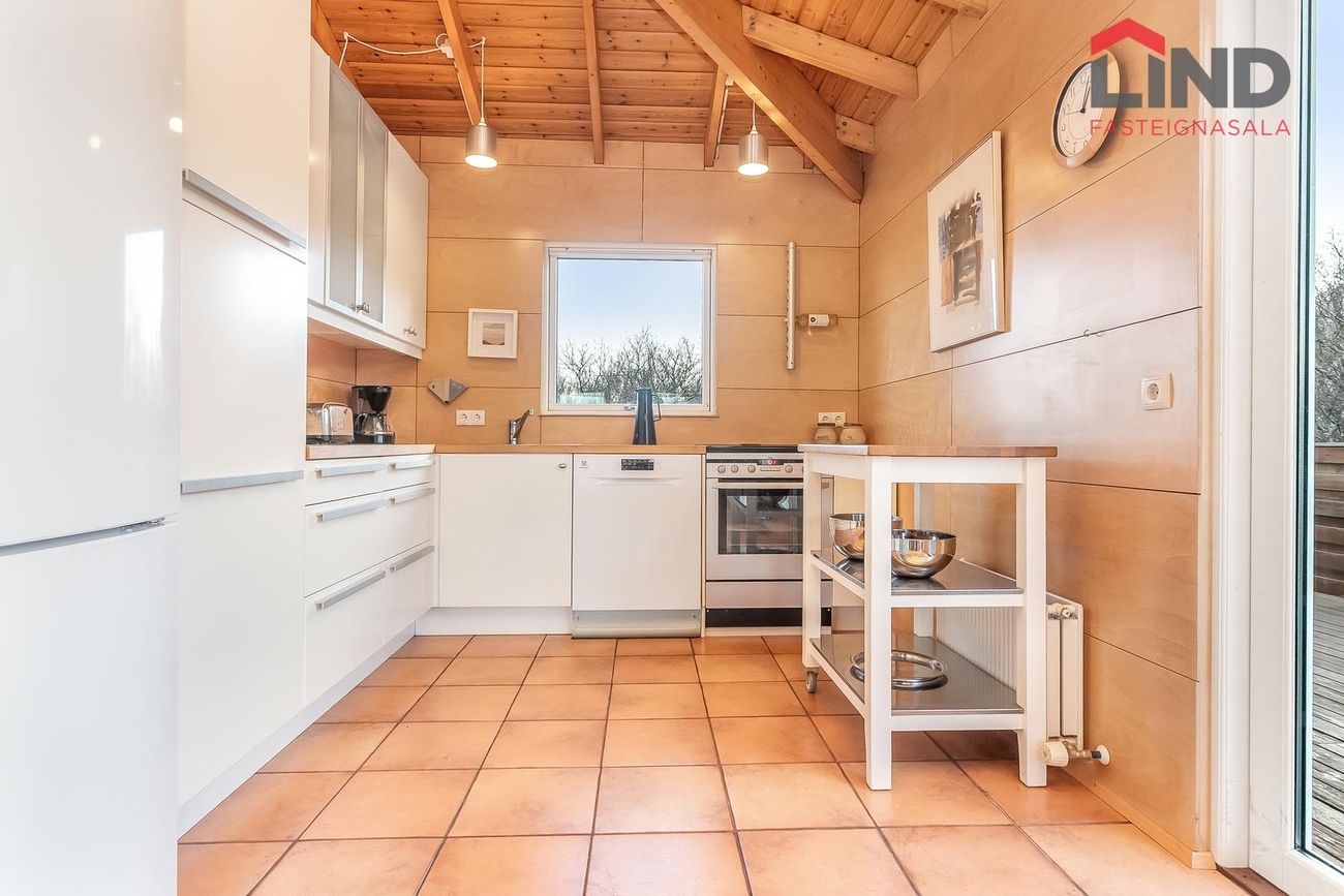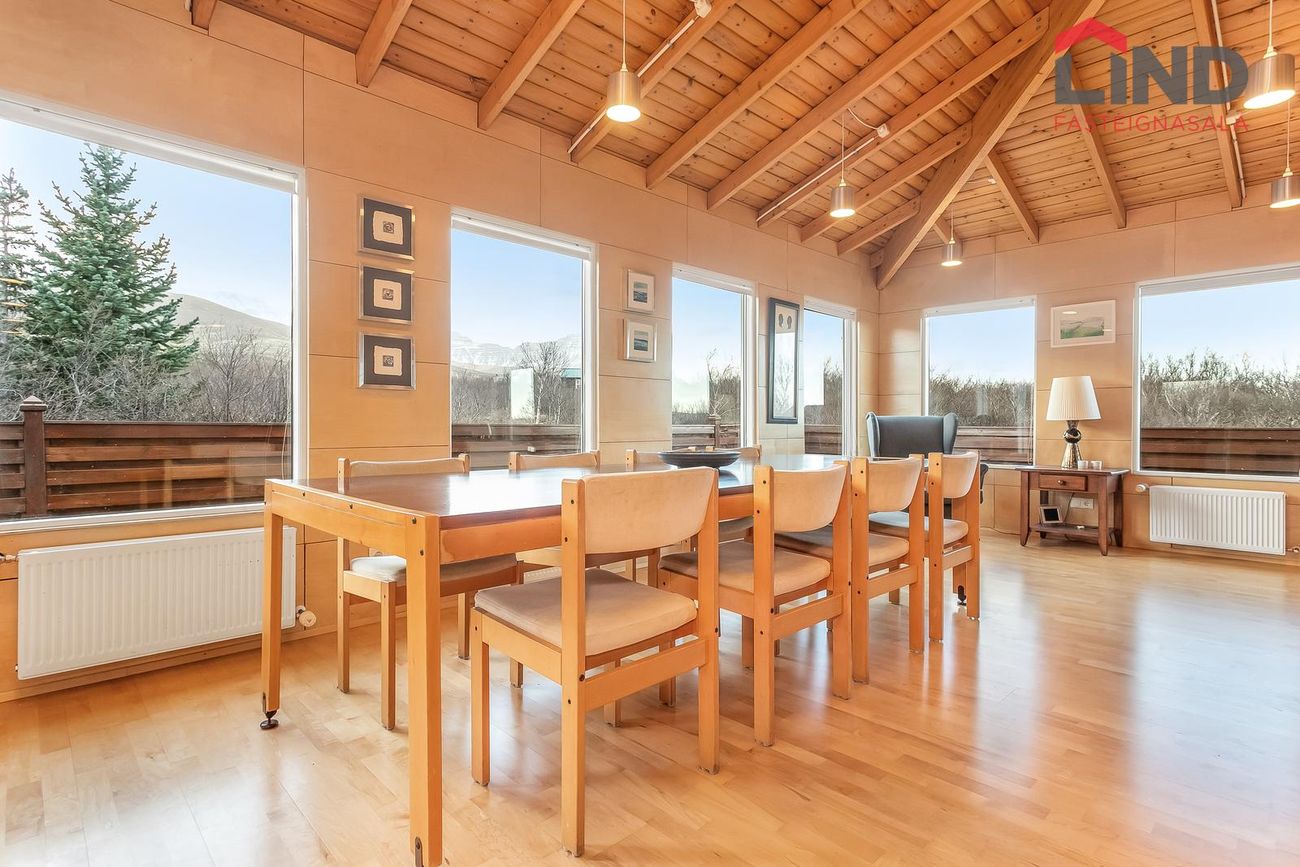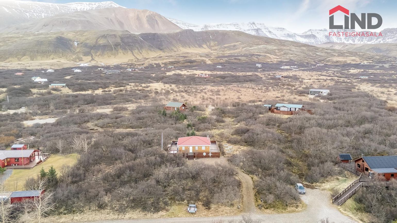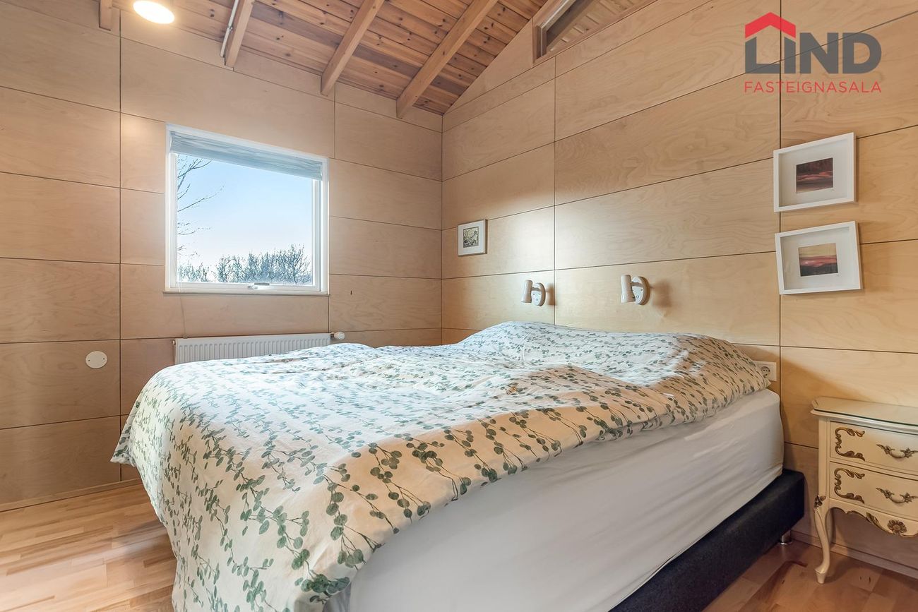 Nánari lýsing Forstofa með flísum á gólfi Eldhús með parketi á gólfi og eldhúsinnréttingu með nýrri uppþvottavél, eldavél, ísskápi með frysti, örbylgjuofni og færanlegri eyju. Stofa-borðstofa með parketi á gólfi, hátt til lofts, stórt nýtt sófasett ásamt stóru borðstofusetti sem rúmar 12-14 manns. Þrjú svefnherbergi, eitt af þeim er með tveimur kojum. Tvö nýleg amerísk rúm og góðar og þykkar svampdýnur í kojunum. Baðherbergi með flísalögðu gólfi, góðri sturtu, þvottavél og þurrkara. Geymsla með hillum.