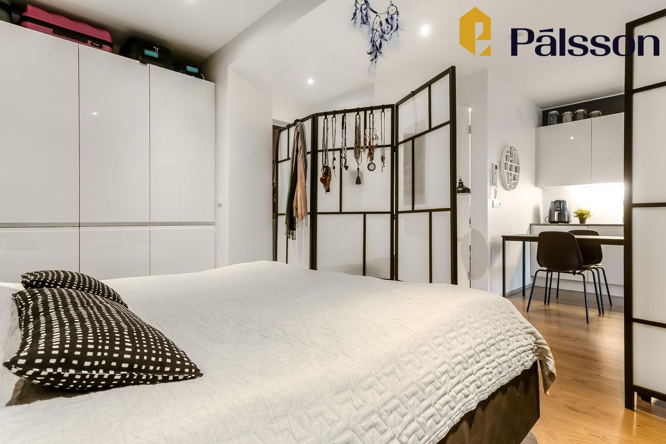 Til hliðar við inngang er opið svefnrými með fataskáp.