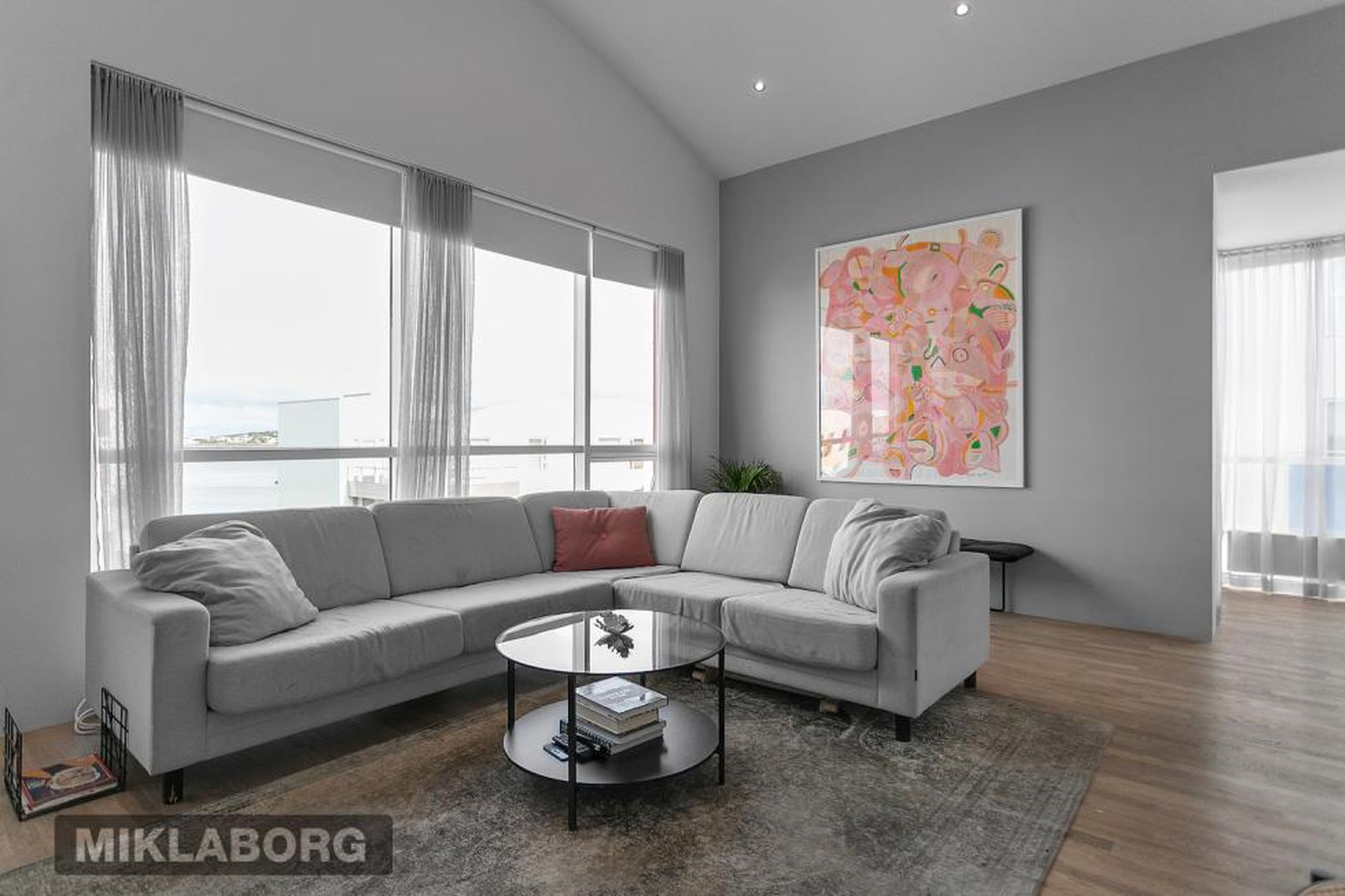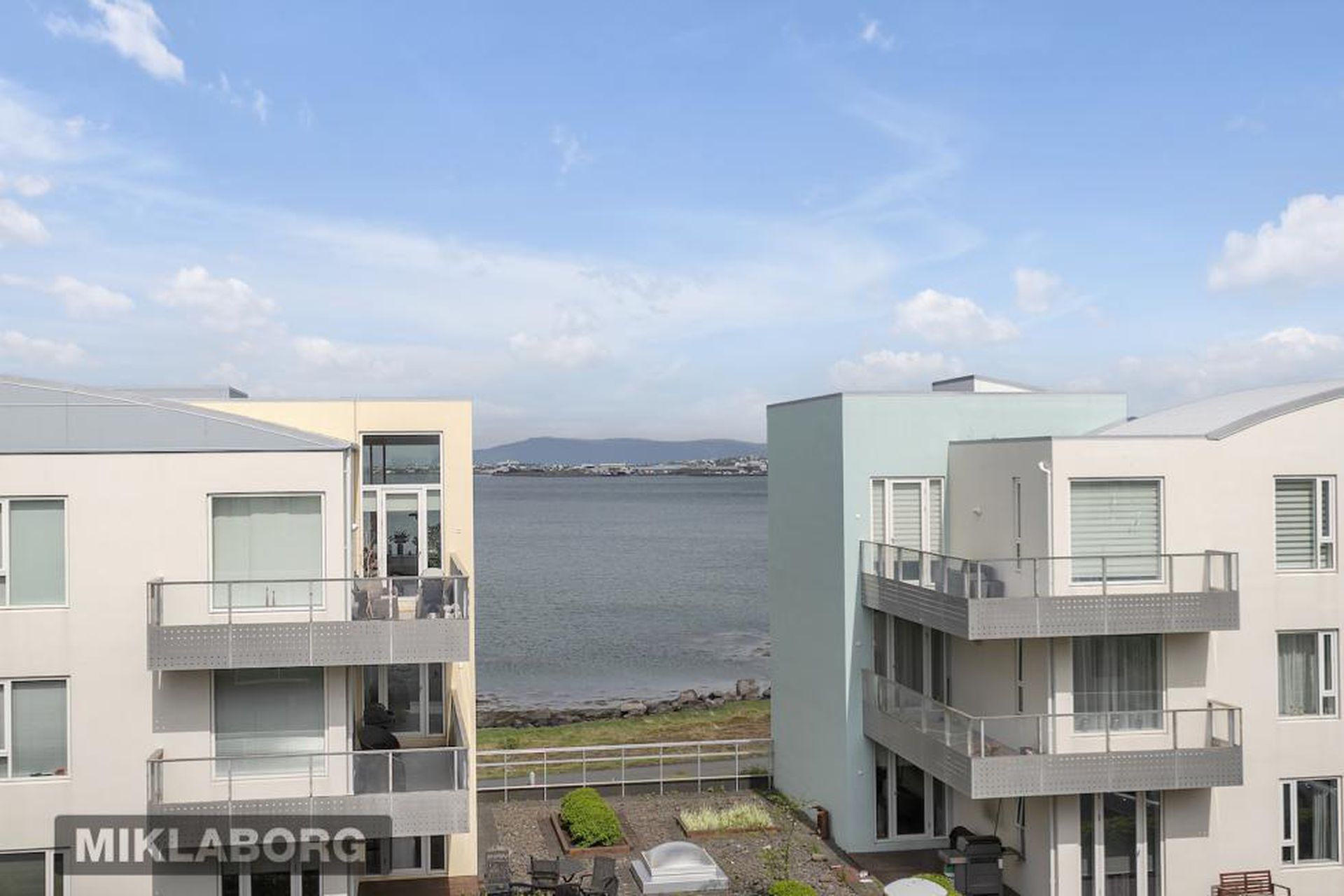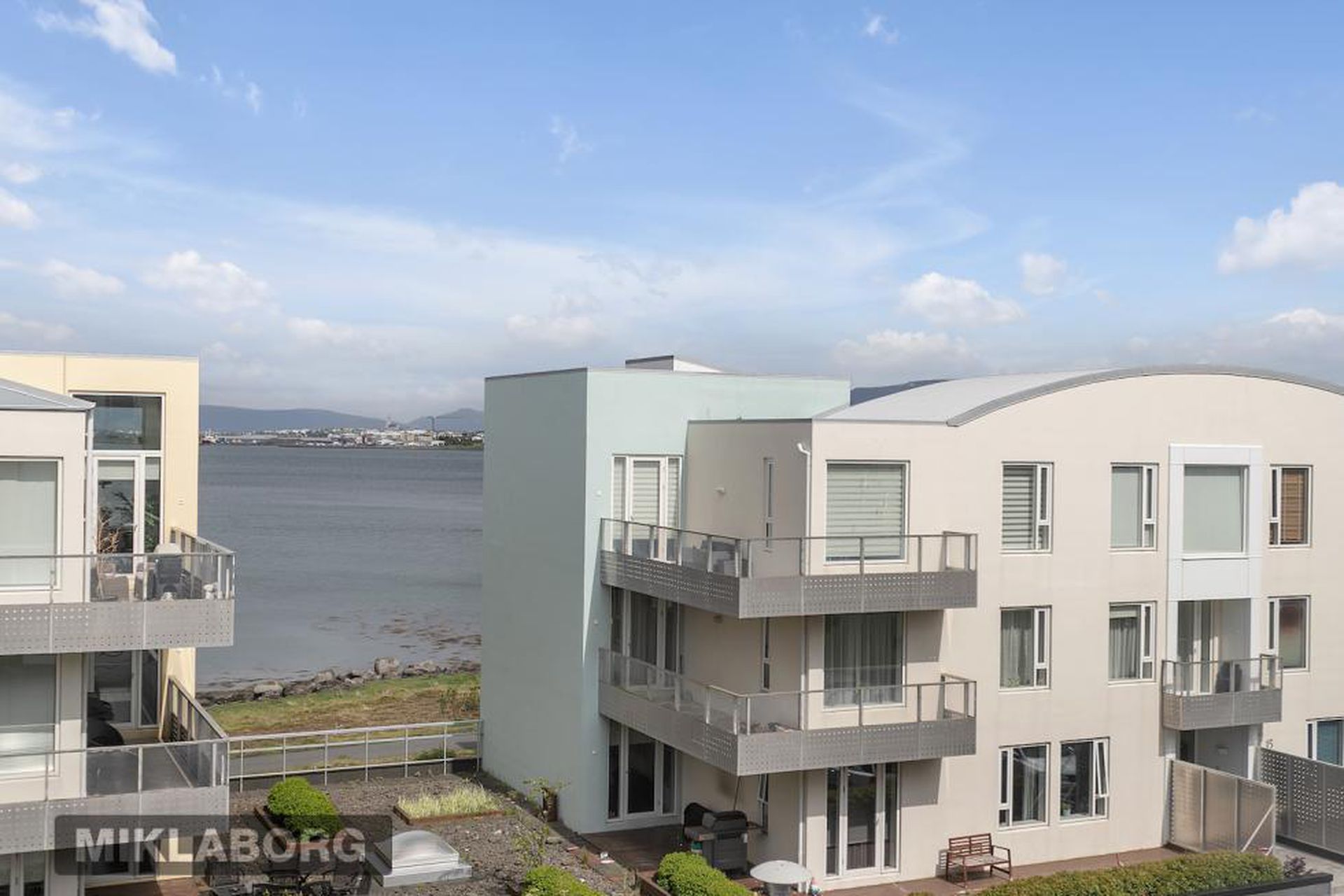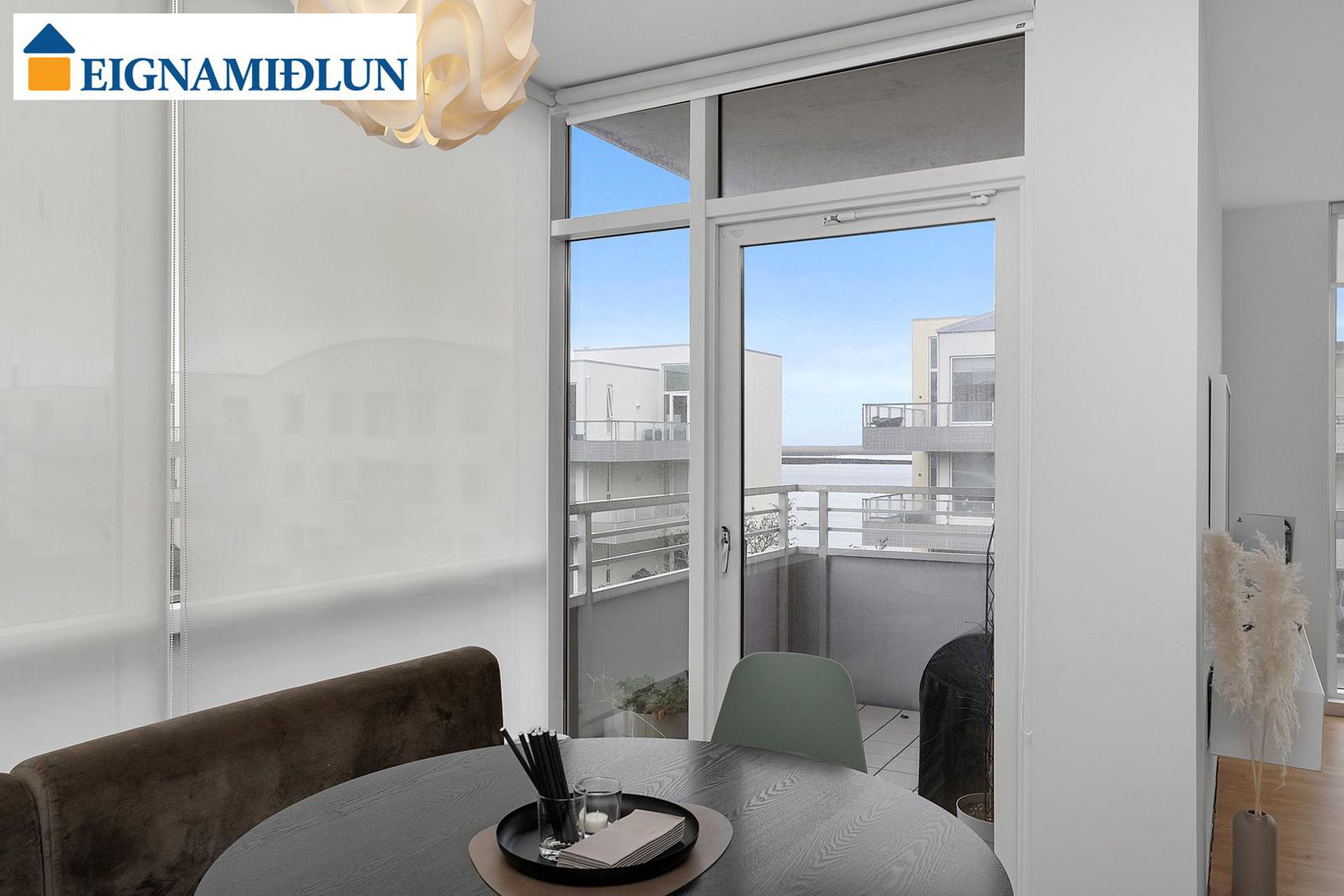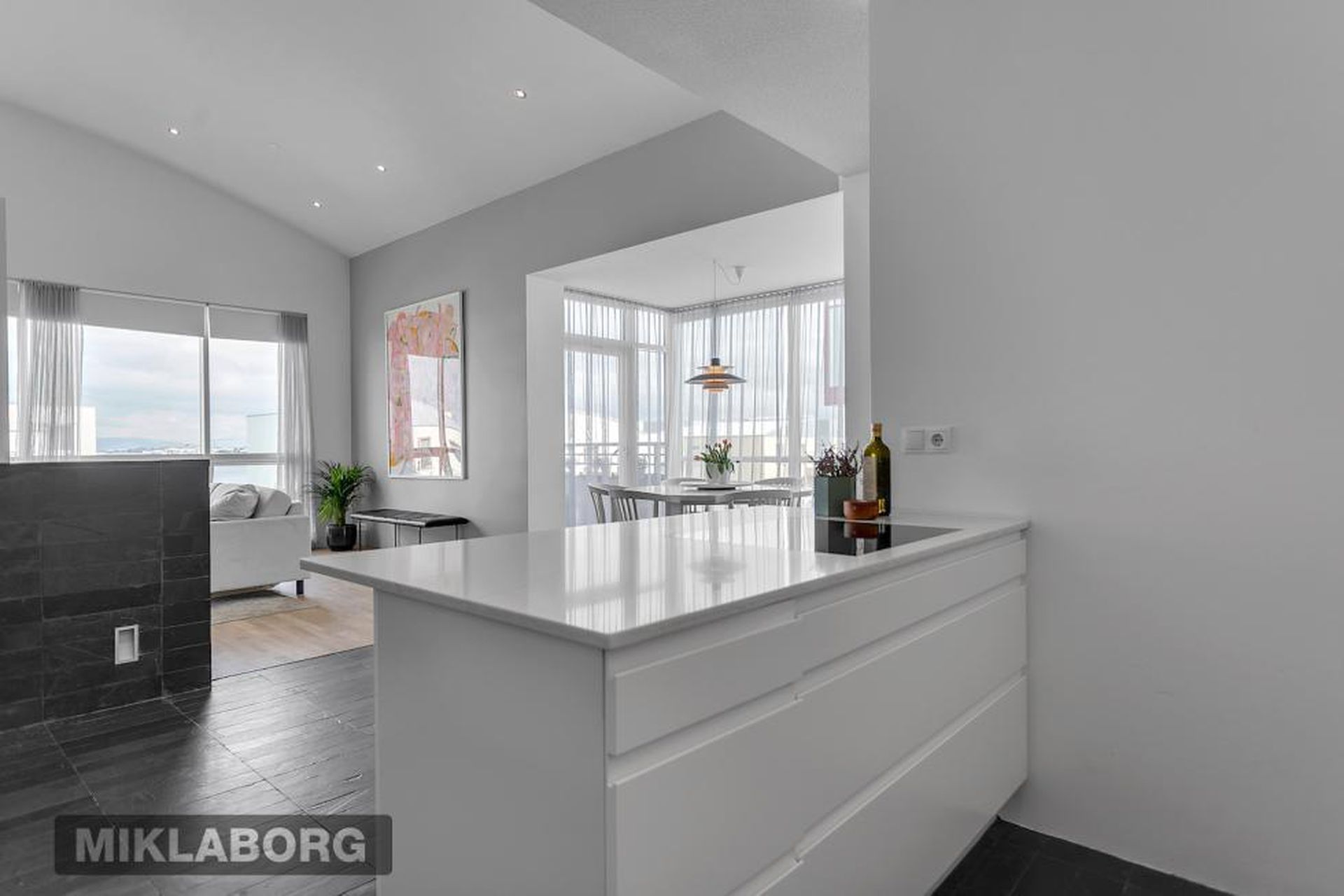 Eldhús, stofa og borðstofa eru í opnu alrými með gólfsíðum gluggum á tvo vegu, mót norðri og vestri. Gengið er út á svalir frá borðstofunni en þær snúa í vestur og sér út á sjó frá þeim.