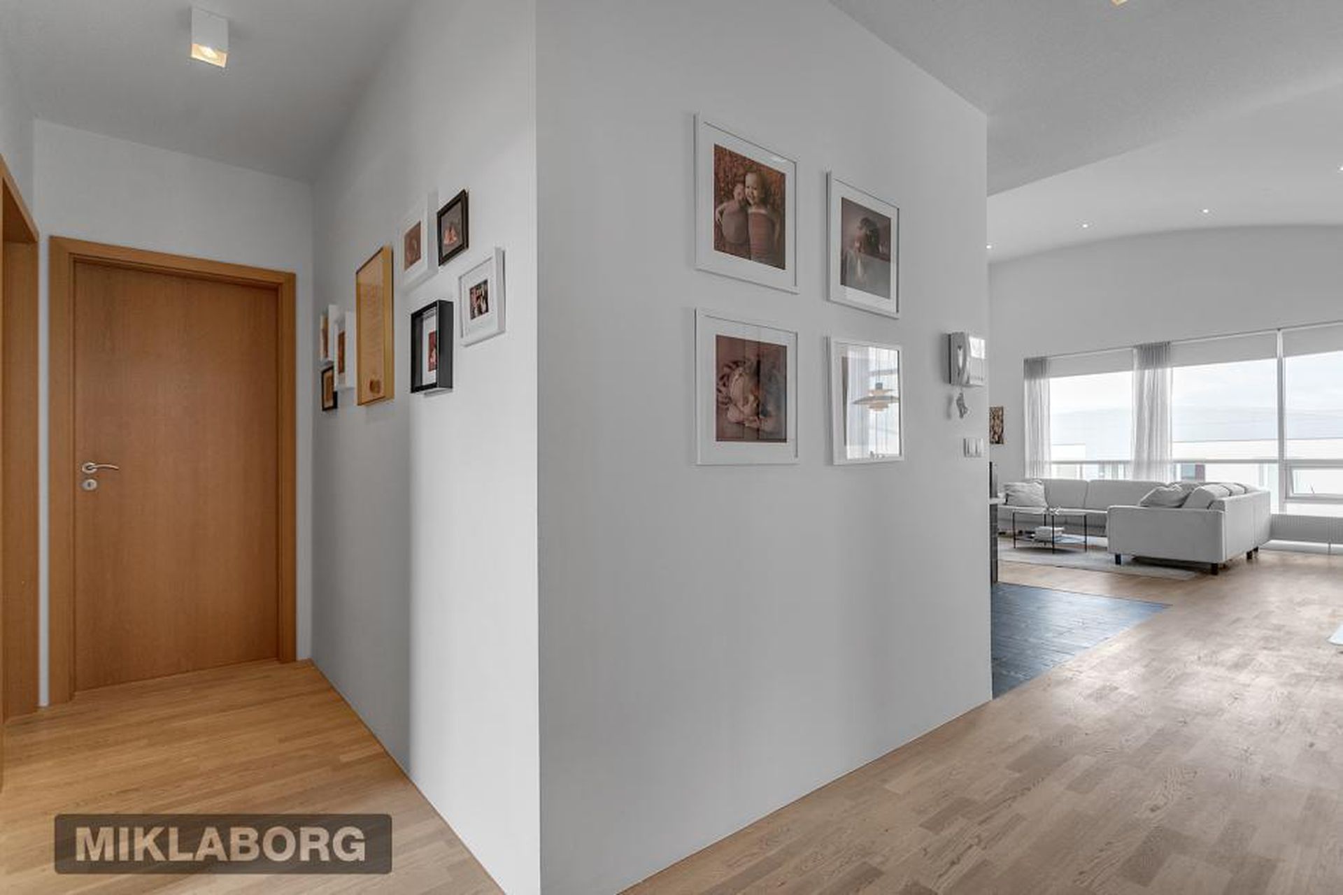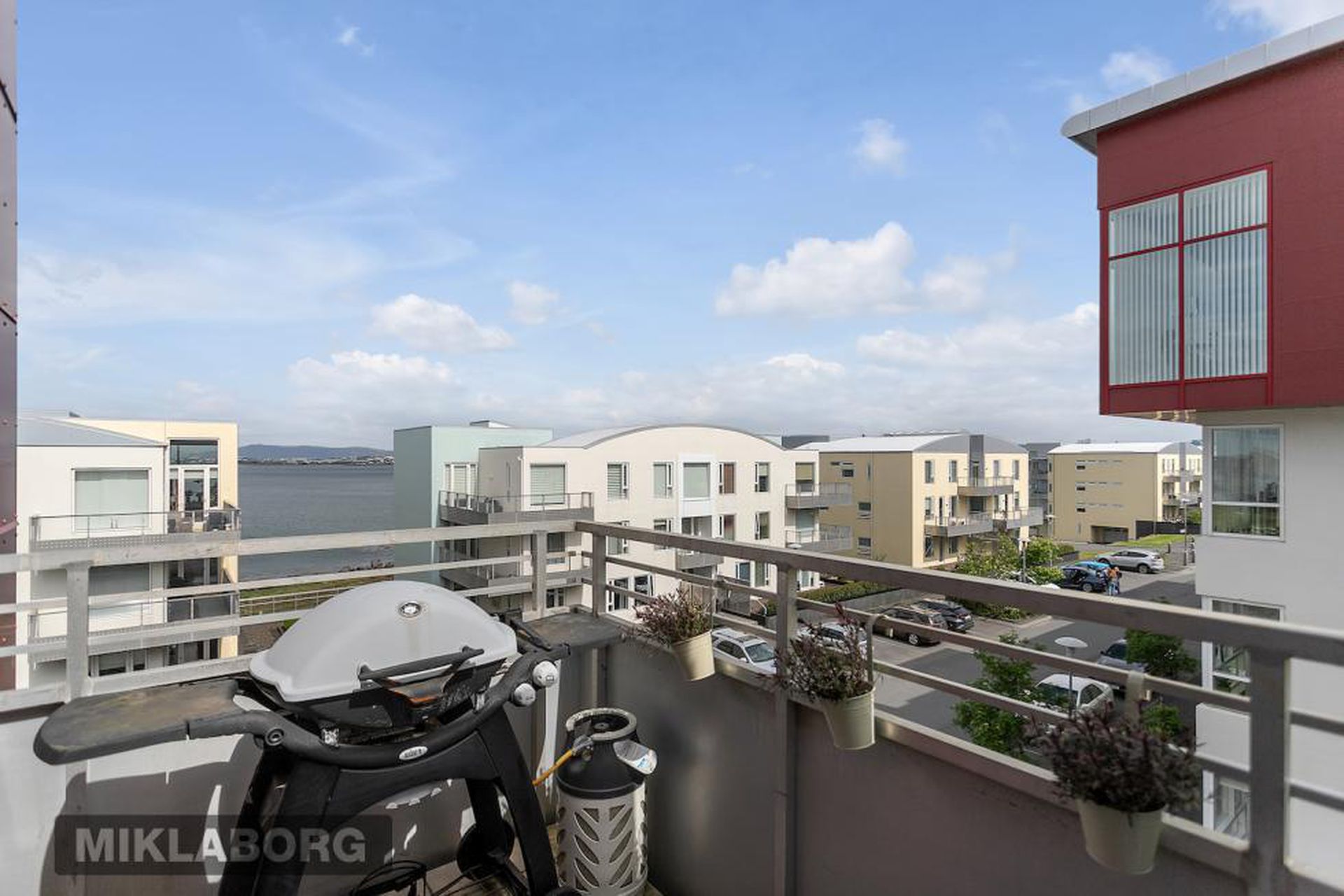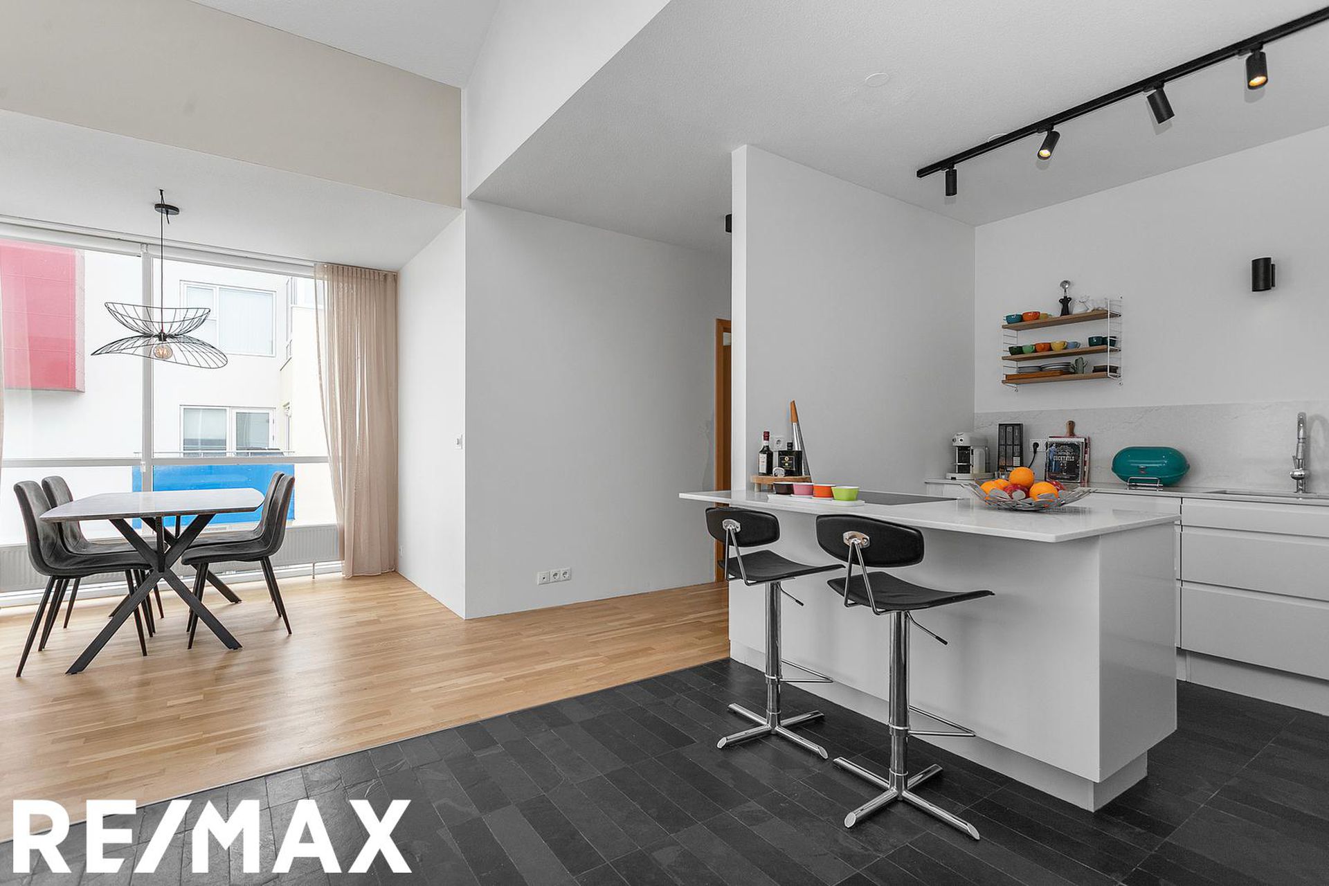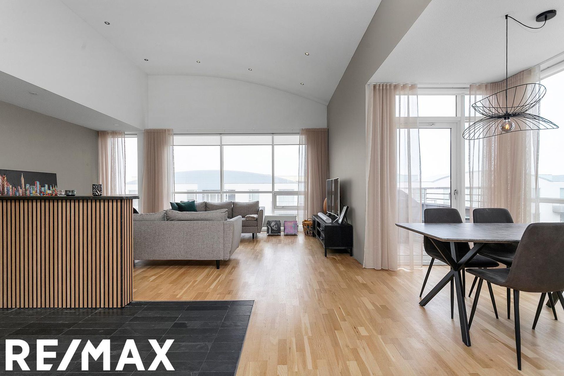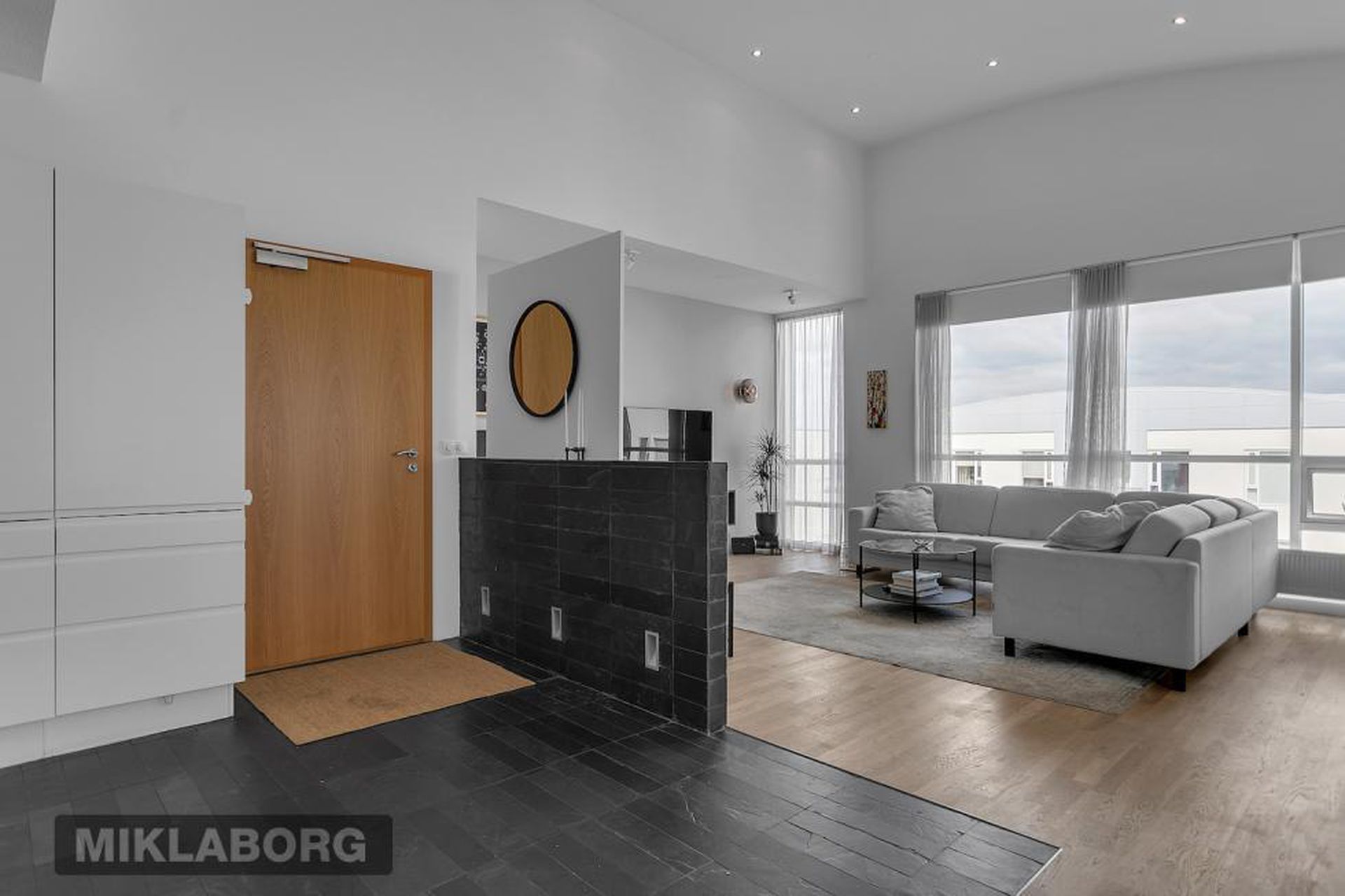 Eldhús, stofa og borðstofa eru í opnu alrými með gólfsíðum gluggum á tvo vegu, mót norðri og vestri. Gengið er út á svalir frá borðstofunni en þær snúa í vestur og sér út á sjó frá þeim.