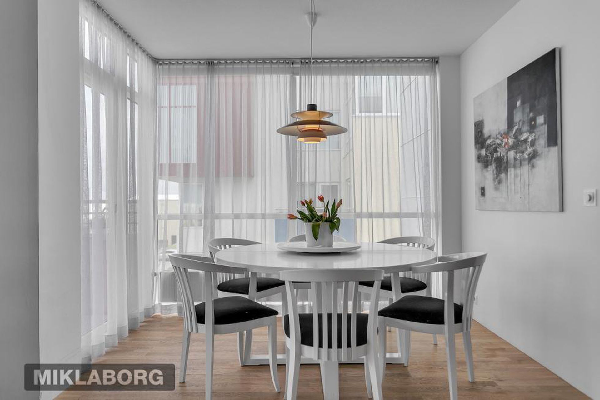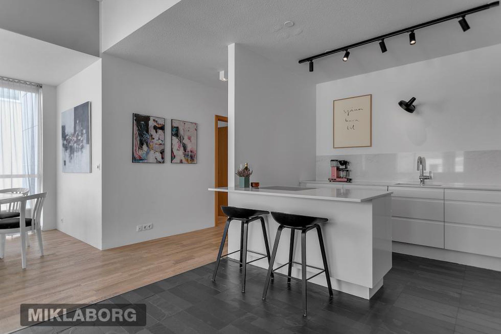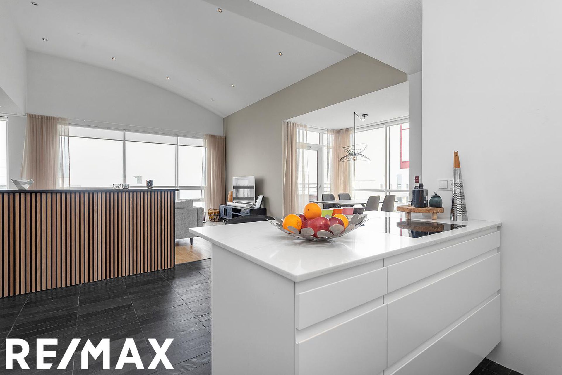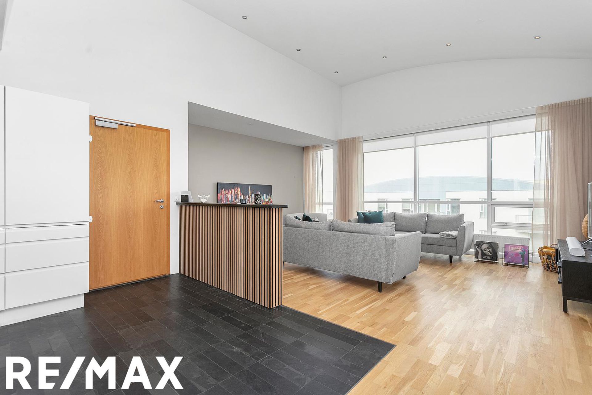 Eldhús, stofa og borðstofa eru í opnu alrými með gólfsíðum gluggum á tvo vegu, mót norðri og vestri. Gengið er út á svalir frá borðstofunni en þær snúa í vestur og sér út á sjó frá þeim.