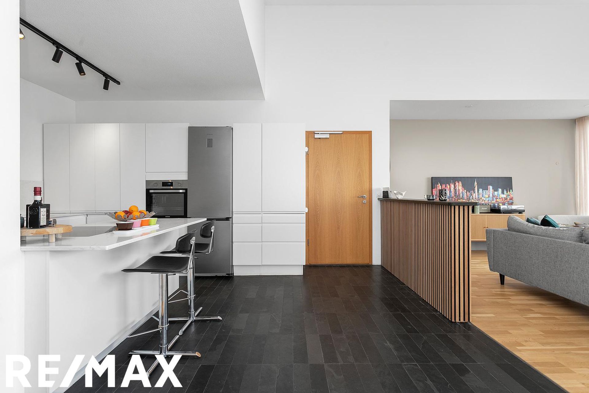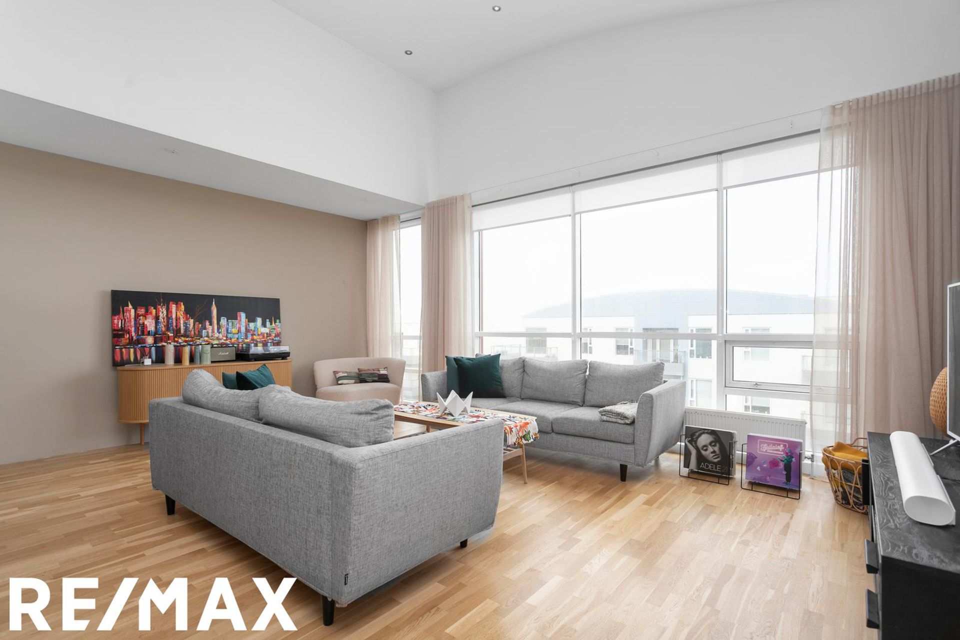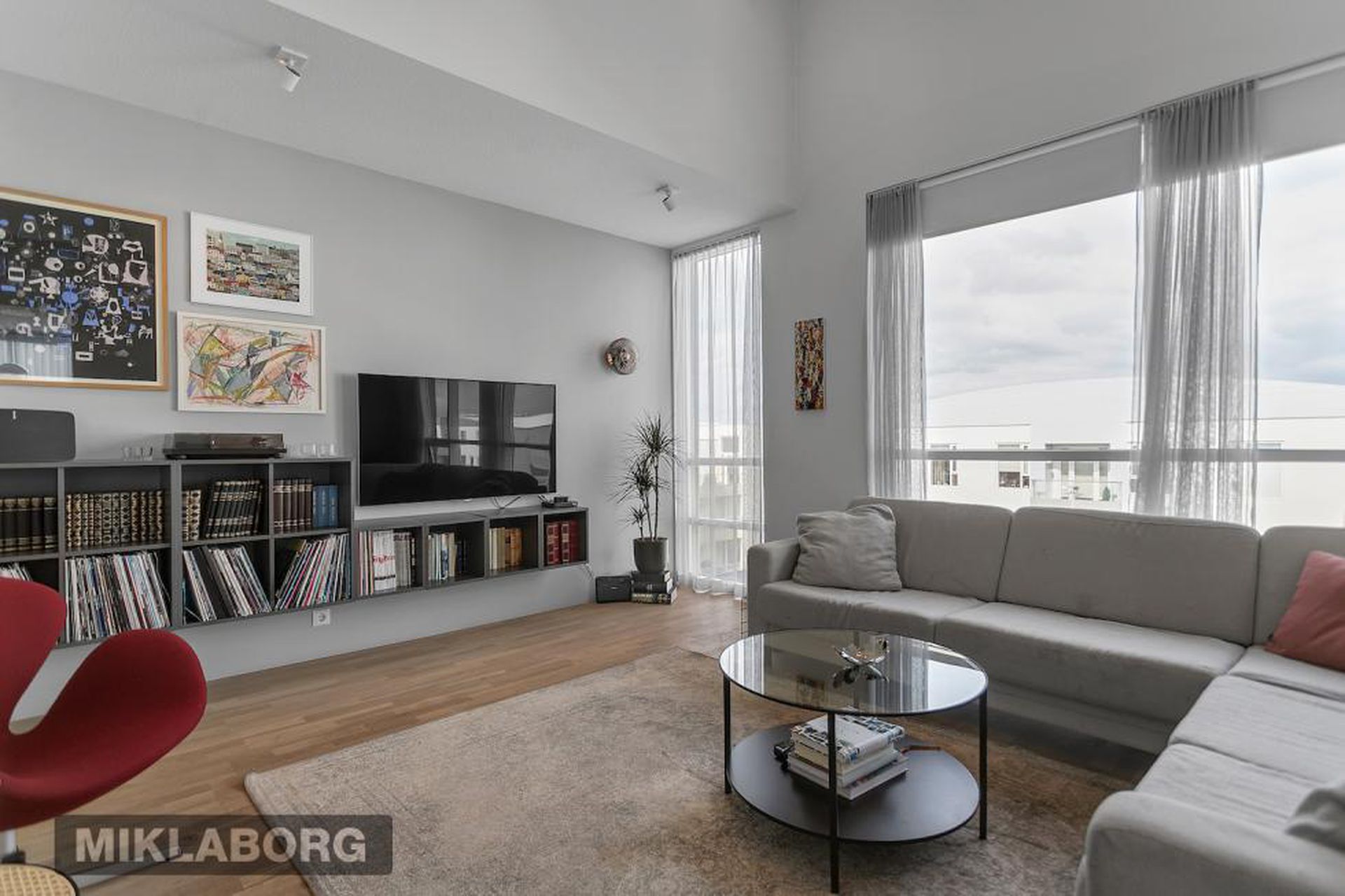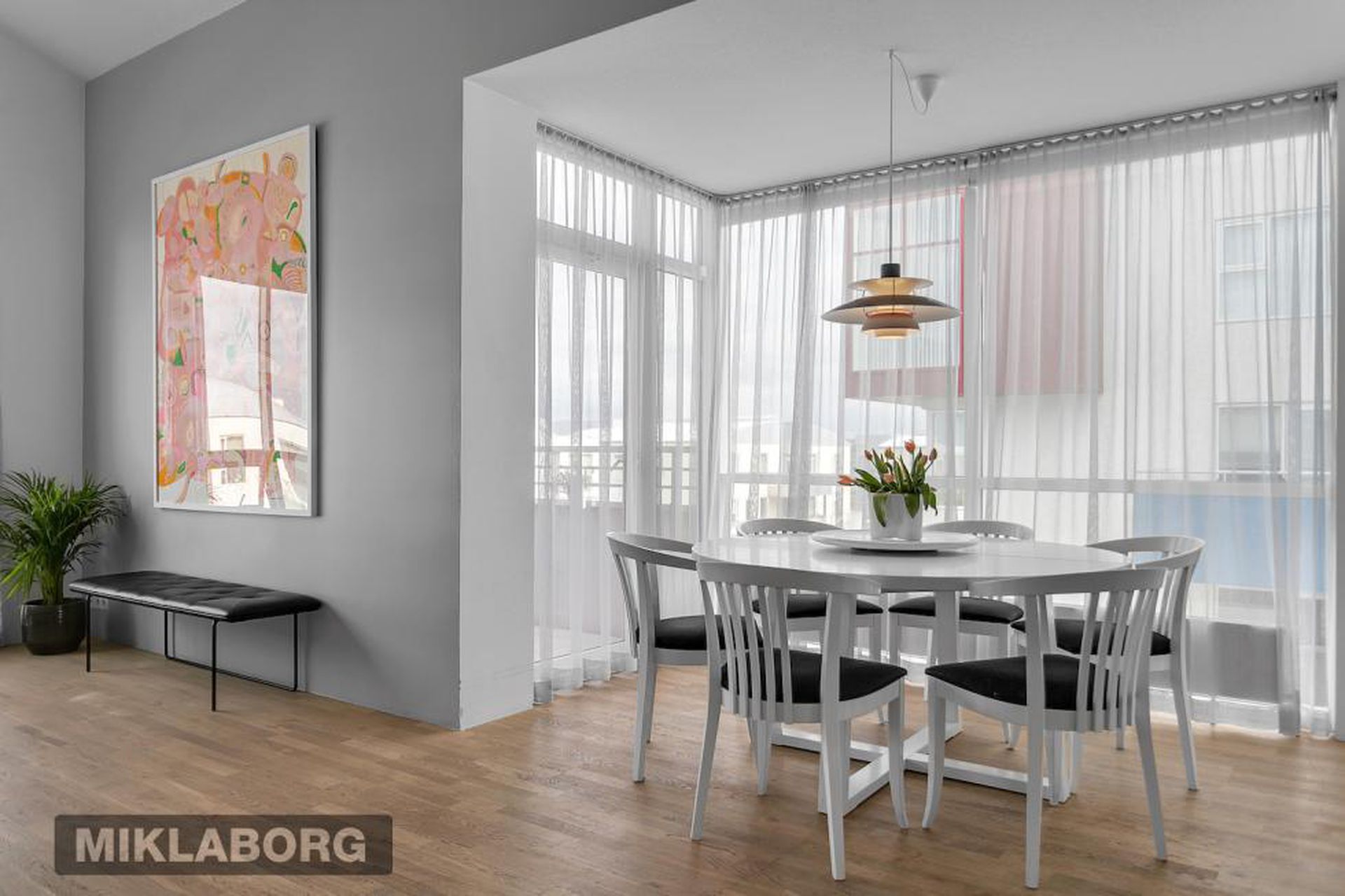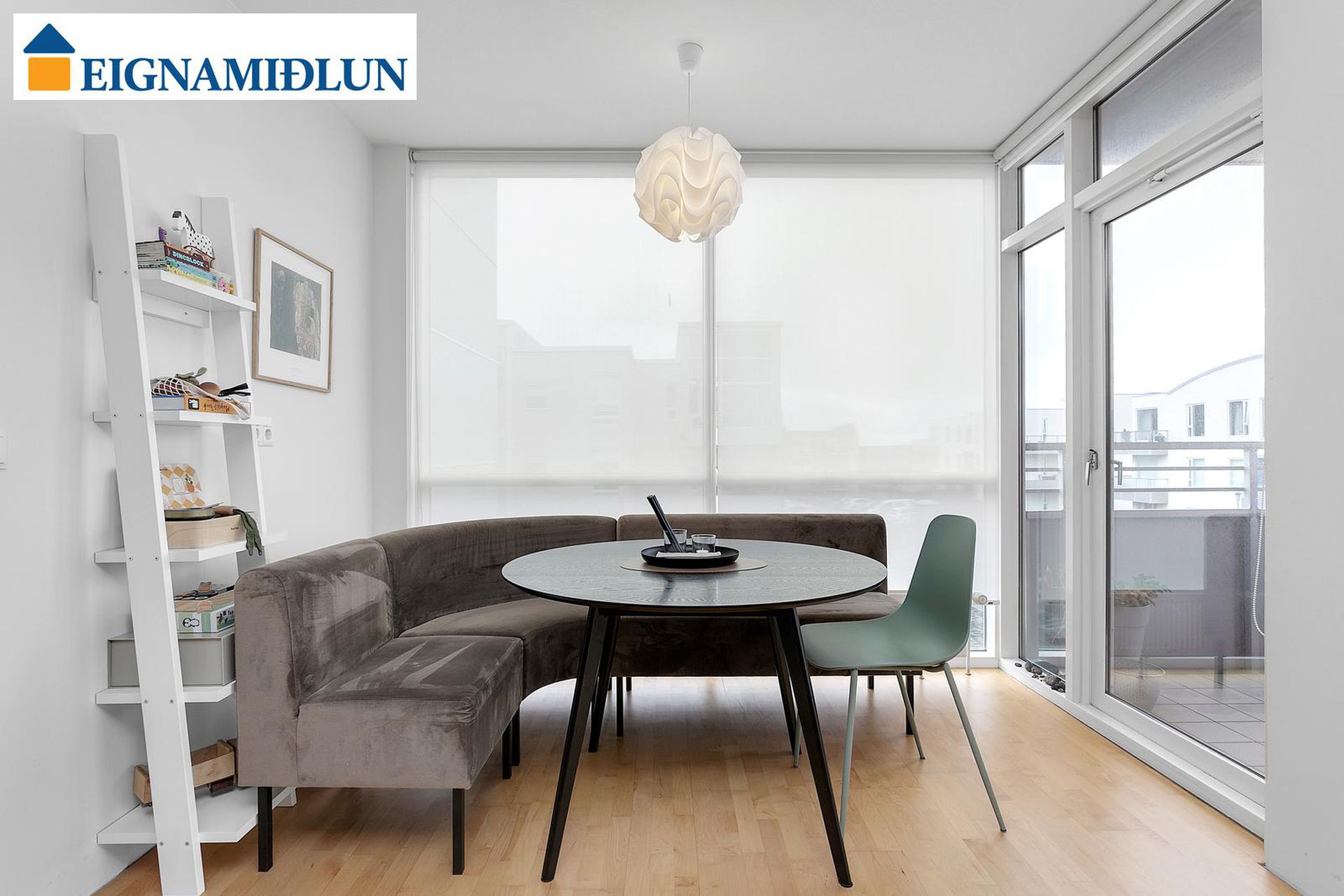 Eldhús, stofa og borðstofa eru í opnu alrými með gólfsíðum gluggum á tvo vegu, mót norðri og vestri. Gengið er út á svalir frá borðstofunni en þær snúa í vestur og sér út á sjó frá þeim.